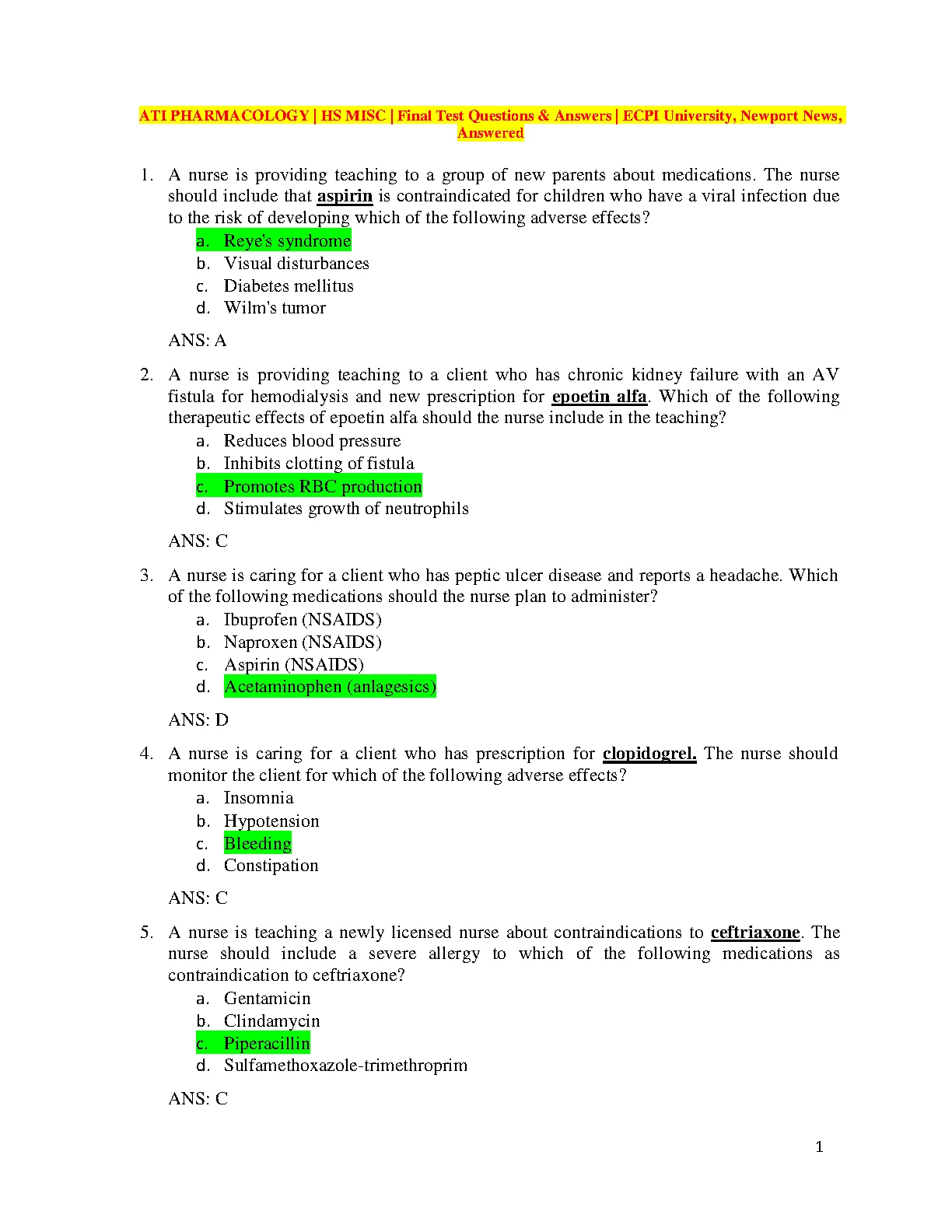 ATI PHARMACOLOGY | HS MISC | Final Test Questions & Answers | ECPI University, Newport News, Answered 2023/2024