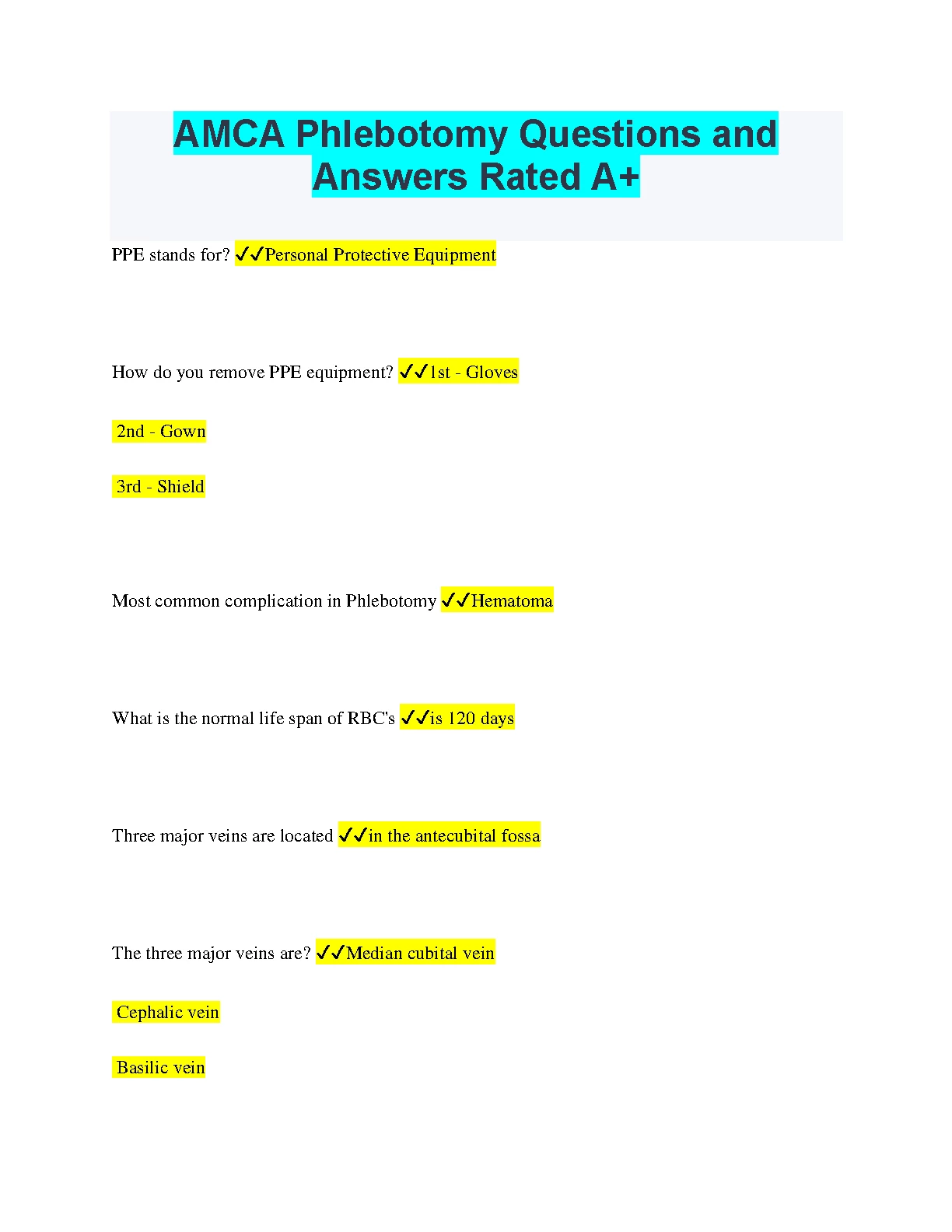 AMCA Phlebotomy Questions and Answers Rated A+ 2023/2024. DOWNLOAD on www.hackedexams.com INSTANTLY.