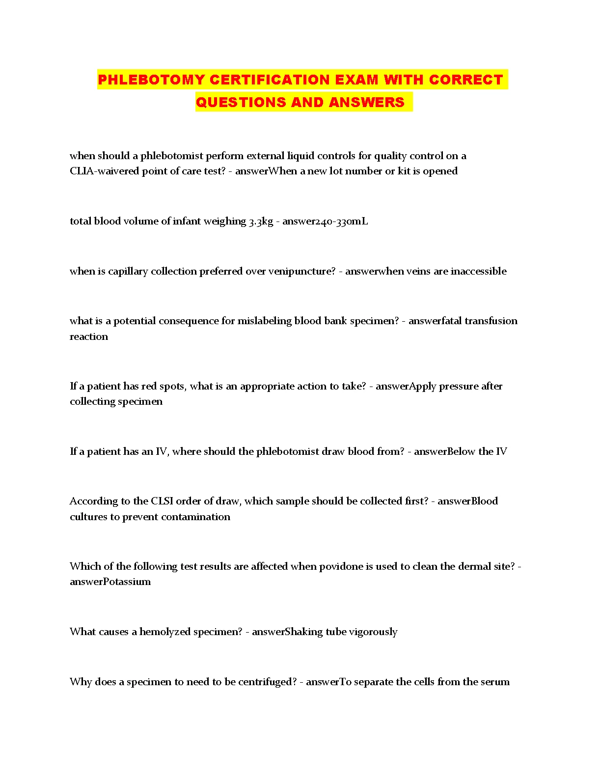 PHLEBOTOMY CERTIFICATION EXAM WITH CORRECT QUESTIONS AND ANSWERS COMPLETE SOLUTION FOR 2023/2024. DOWNLOAD on www.hackedexams.com INSTANTLY.