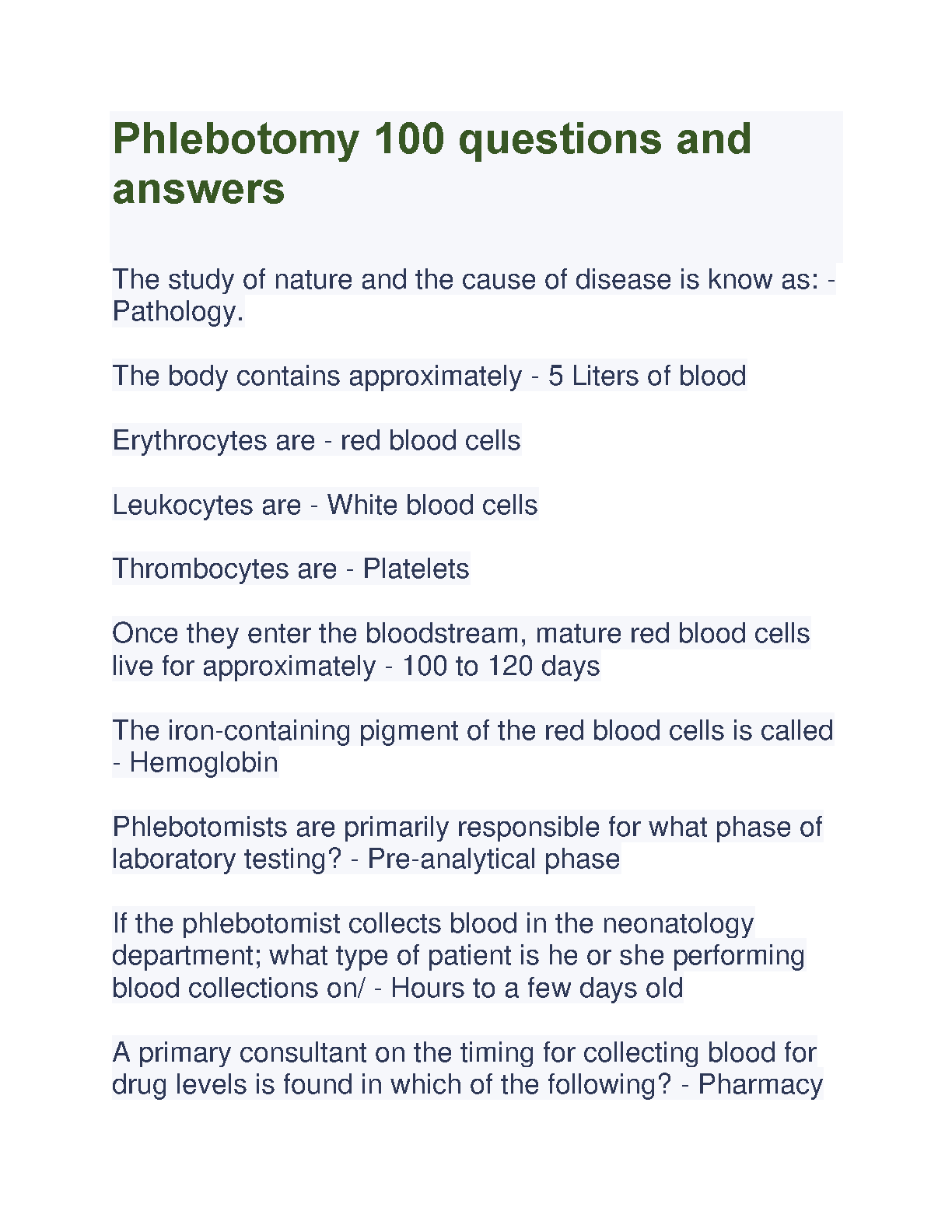 Phlebotomy 100 questions and answers CORRECT AND VERIFIED 2023