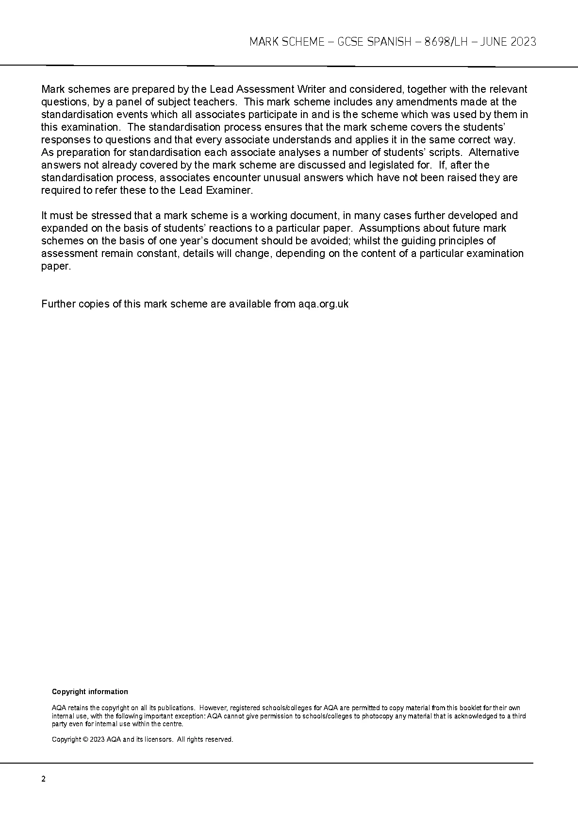 2023 AQA GCSE SPANISH PAPER 1 2023 MARK SCHEME (8698/LH: Listening Higher). DOWNLOAD on www.Hackedexams.com INSTANTLY.