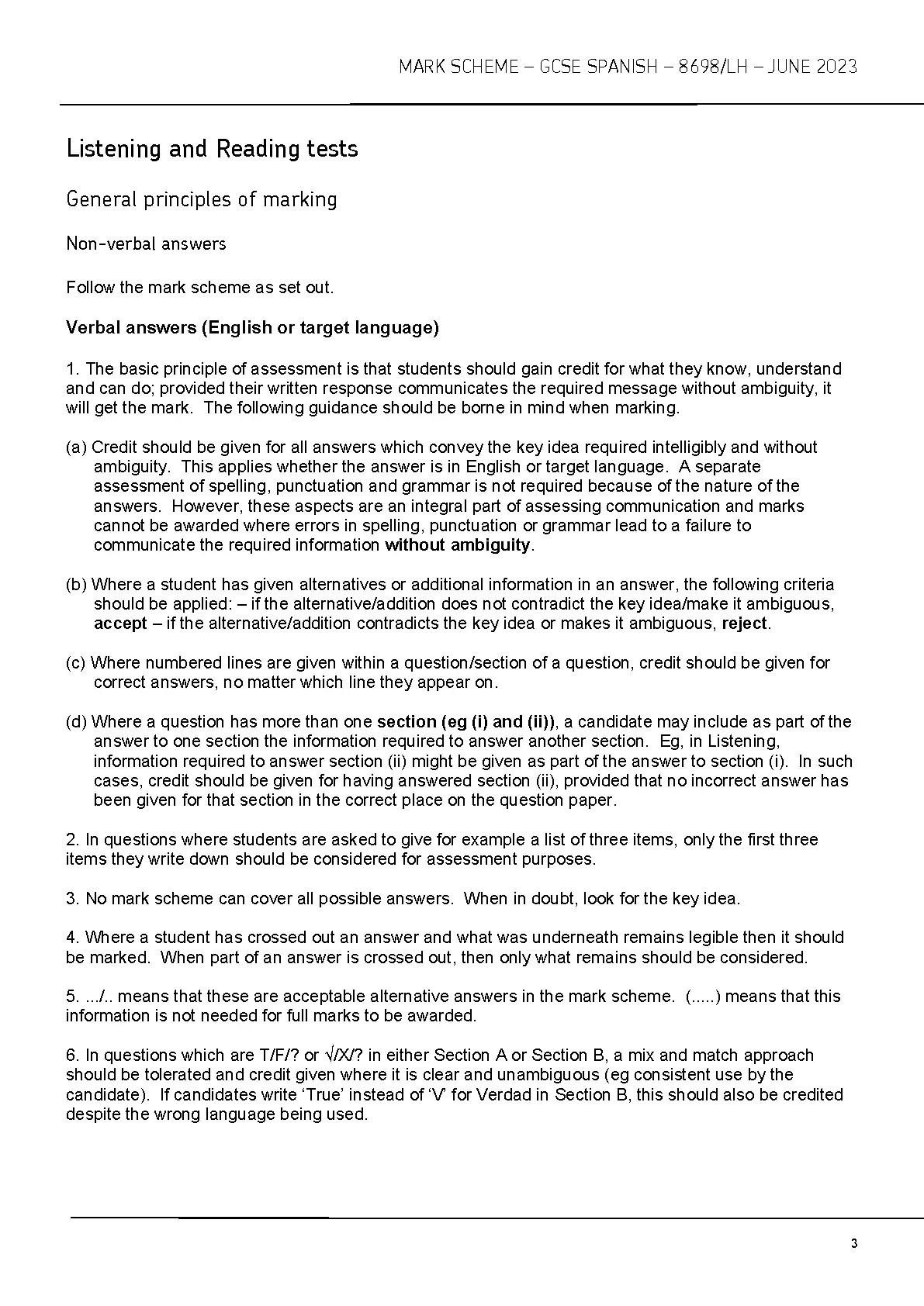 2023 AQA GCSE SPANISH PAPER 1 2023 MARK SCHEME (8698/LH: Listening Higher).