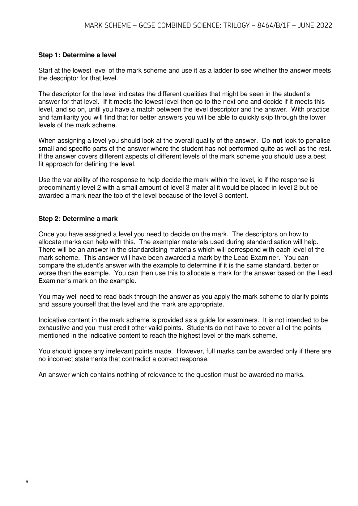 AQA GCSE COMBINED SCIENCE: TRILOGY PAPER 1F JUNE 2022 MARK SCHEME (8464/B/1F: Foundation Tier Biology Paper 1F)