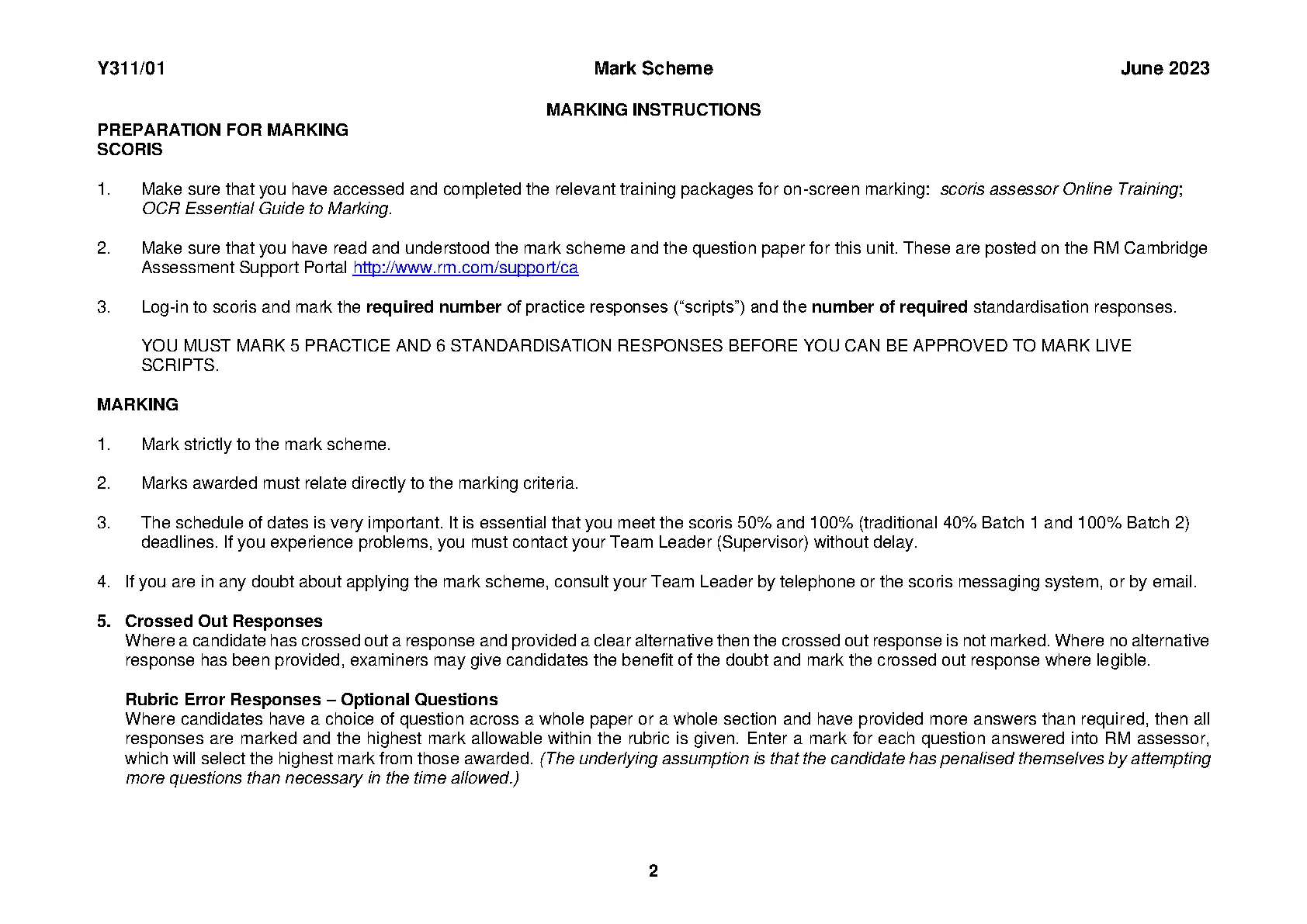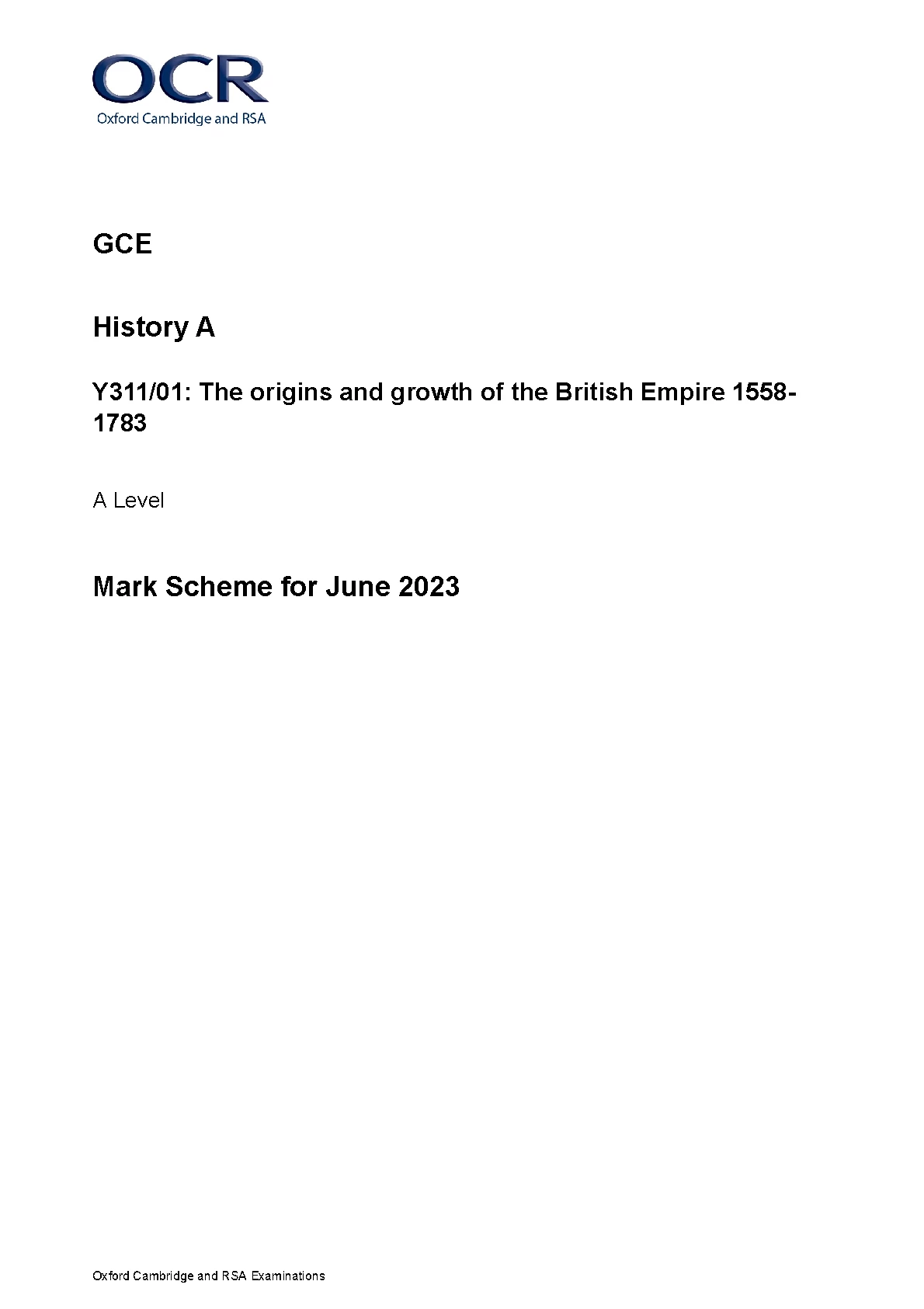 2023 OCR A LEVEL HISTORY A PAPER 3 MARK SCHEME (Y311/01: The origins and growth of the British Empire 1558- 1783).