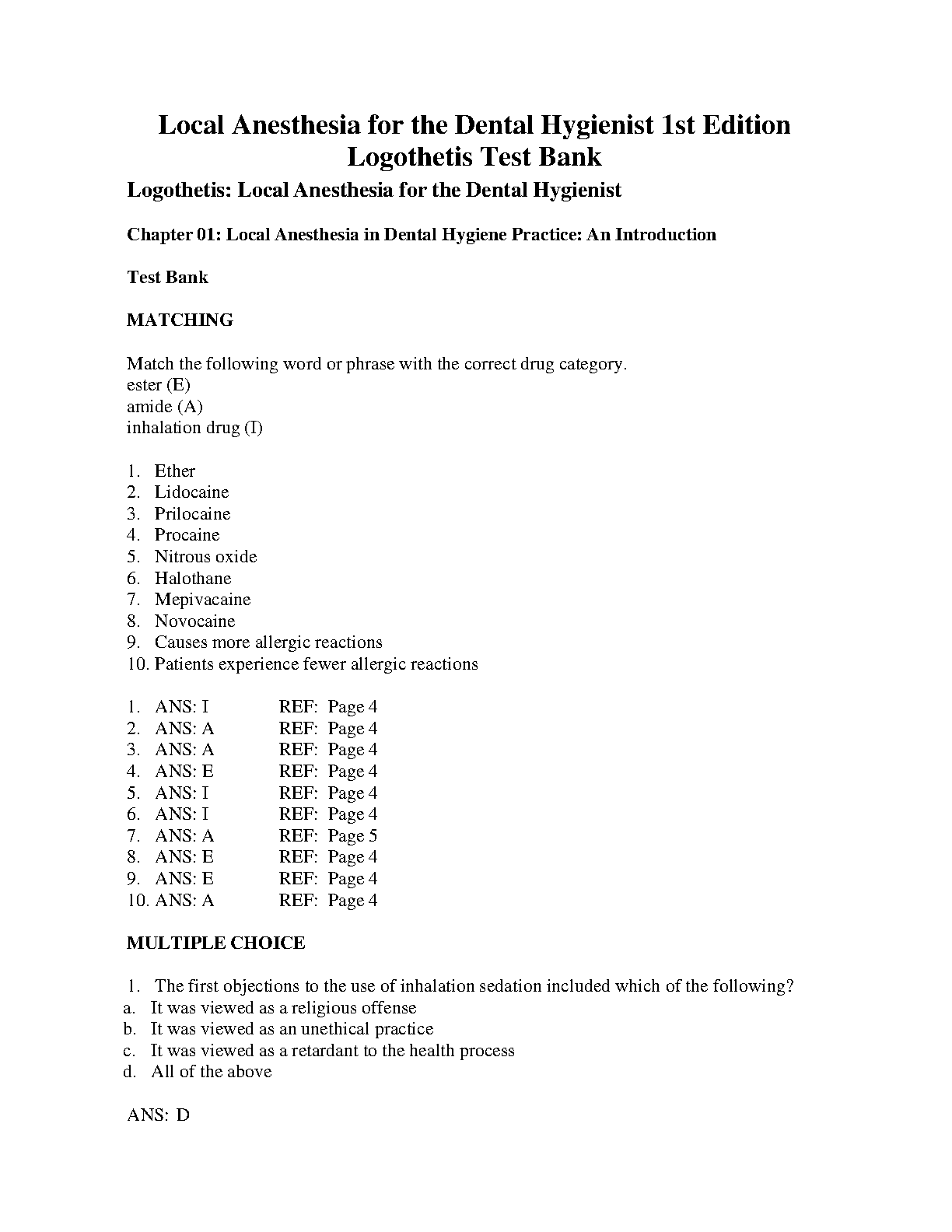 TEST BANK - Logothetis: Local Anesthesia for the Dental Hygienist