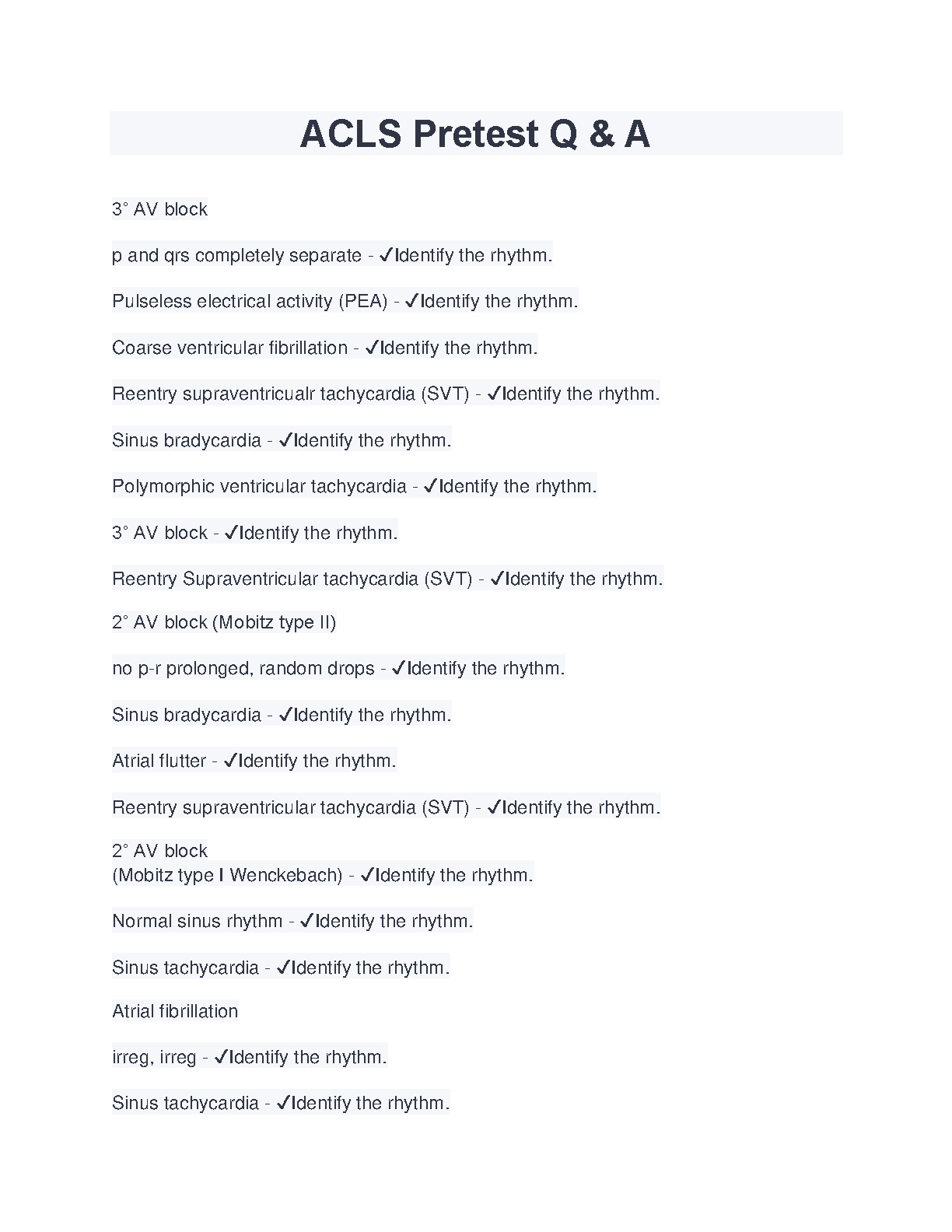 This resource contains a comprehensive set of ACLS pretest questions and answers. It aims to help students practice identifying various cardiac rhythms, including 3rd degree AV block, pulseless electrical activity, coarse ventricular fibrillation, reentry supraventricular tachycardia, sinus bradycardia, polymorphic ventricular tachycardia, atrial flutter, and more.