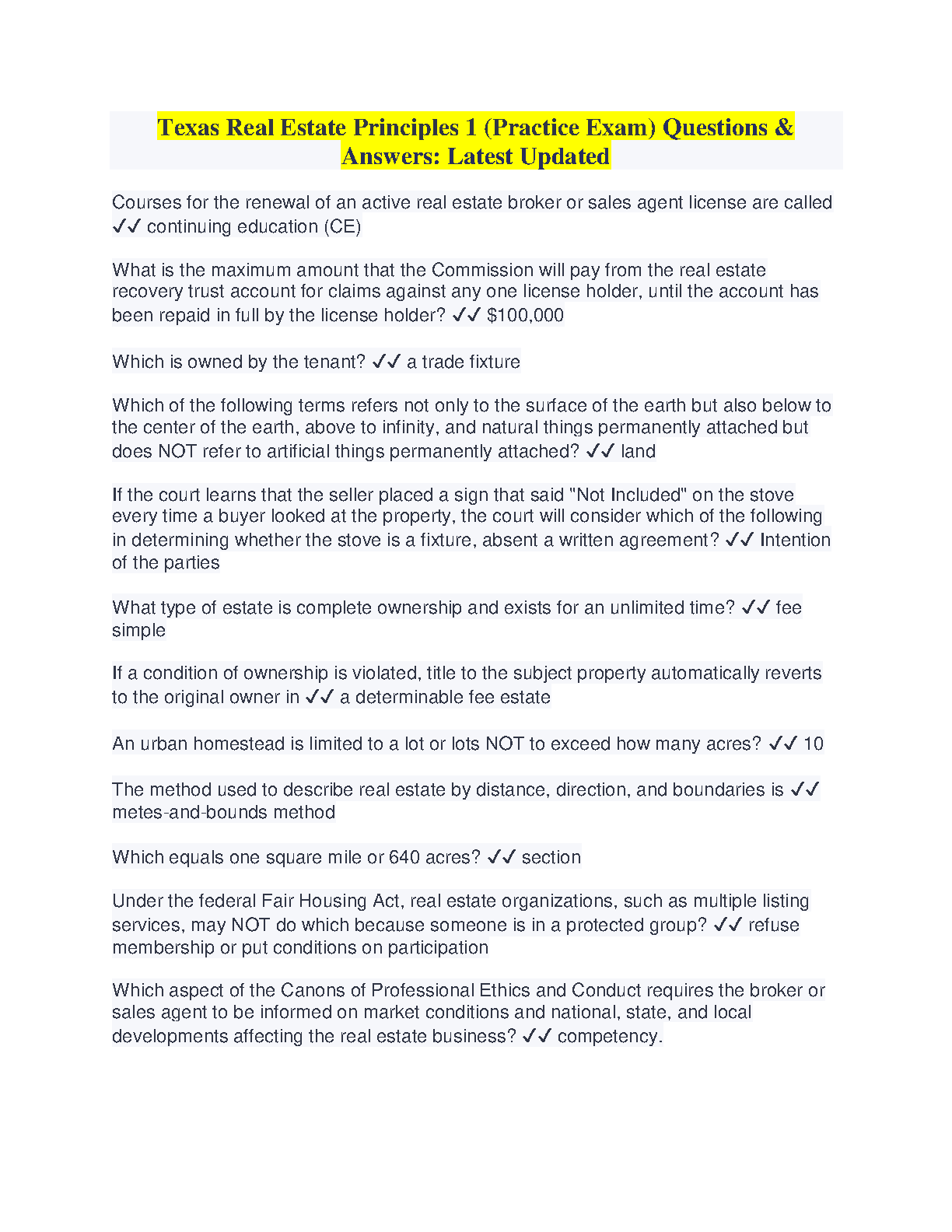 Texas Real Estate Principles 1 (Practice Exam) Questions & Answers: Latest Updated, 2024-2025 Edition, by [Author names to be found online]