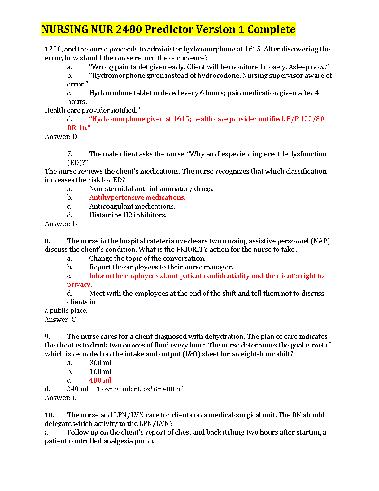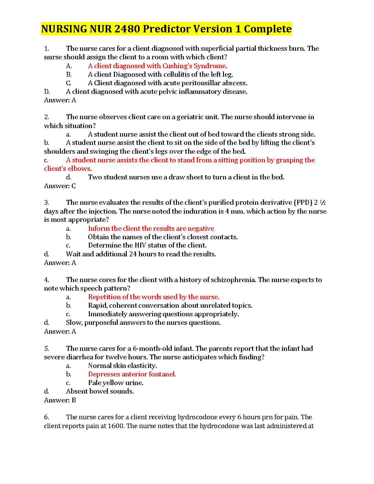 Nursing NUR 2480 Predictor Version 1 Complete by Linda Anne Silvestri, RN, MSN, CCRN, and Joseph F. Silvestri, RN, BSN, CCRN