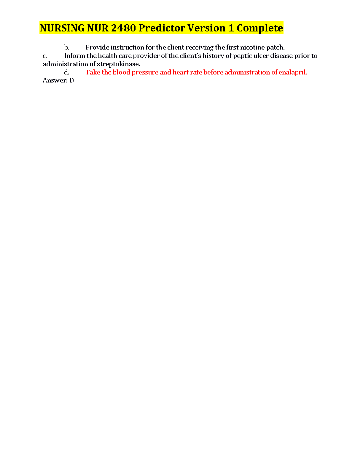 This resource is a complete predictor for Nursing NUR 2480, designed to help students prepare for their exams and achieve success on their first attempt. It covers a comprehensive range of topics and concepts, providing valuable insights and practice questions to solidify understanding.