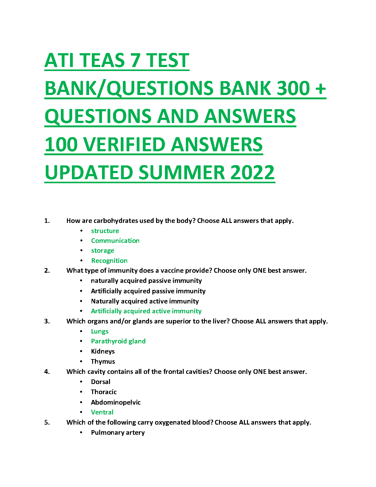 ATI TEAS 7 Test Bank: 300+ Questions and Answers with 100 Verified Solutions (Updated Summer 2022)