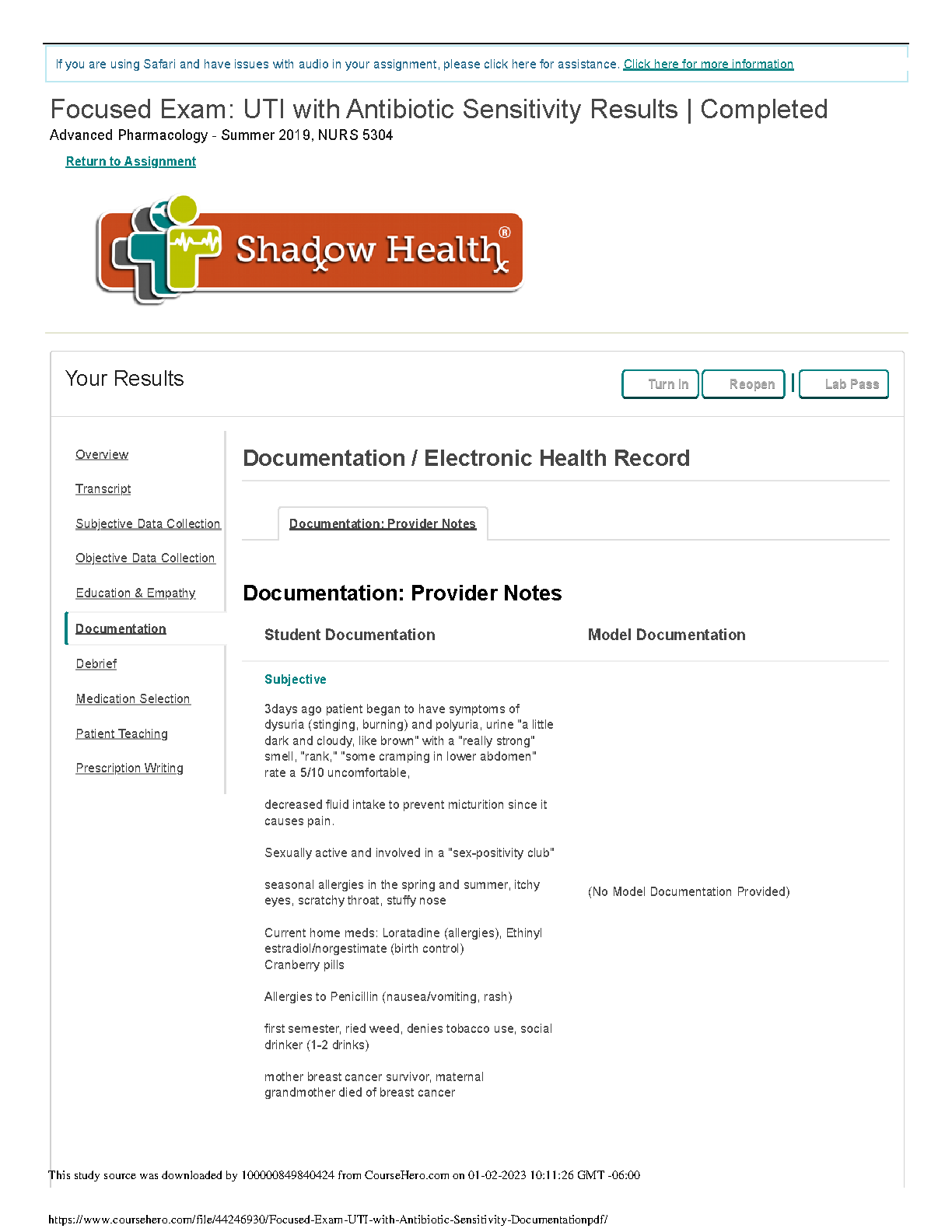 This comprehensive guide offers a detailed look into the documentation and electronic health record aspects of a UTI case. Perfect for students preparing for their 2024/2025 exams, this resource will enhance understanding and ensure exam success on the first attempt.