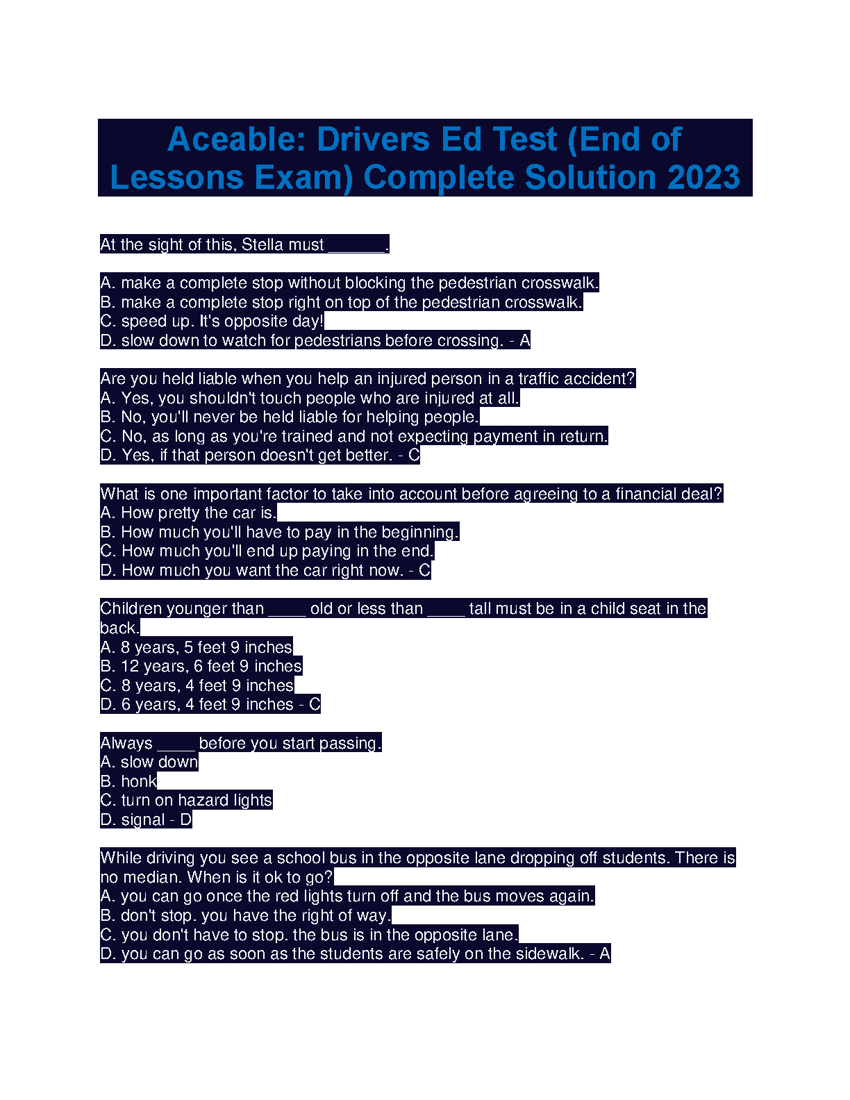 Aceable: Drivers Ed Test (End of Lessons Exam) Complete Solution 2023. This study guide will help you pass your drivers ed test on the first try, ensuring you are prepared for the road. Aceable's complete solution covers all the necessary topics and provides practice questions to solidify your understanding. Get ready to ace your exam and hit the road with confidence!