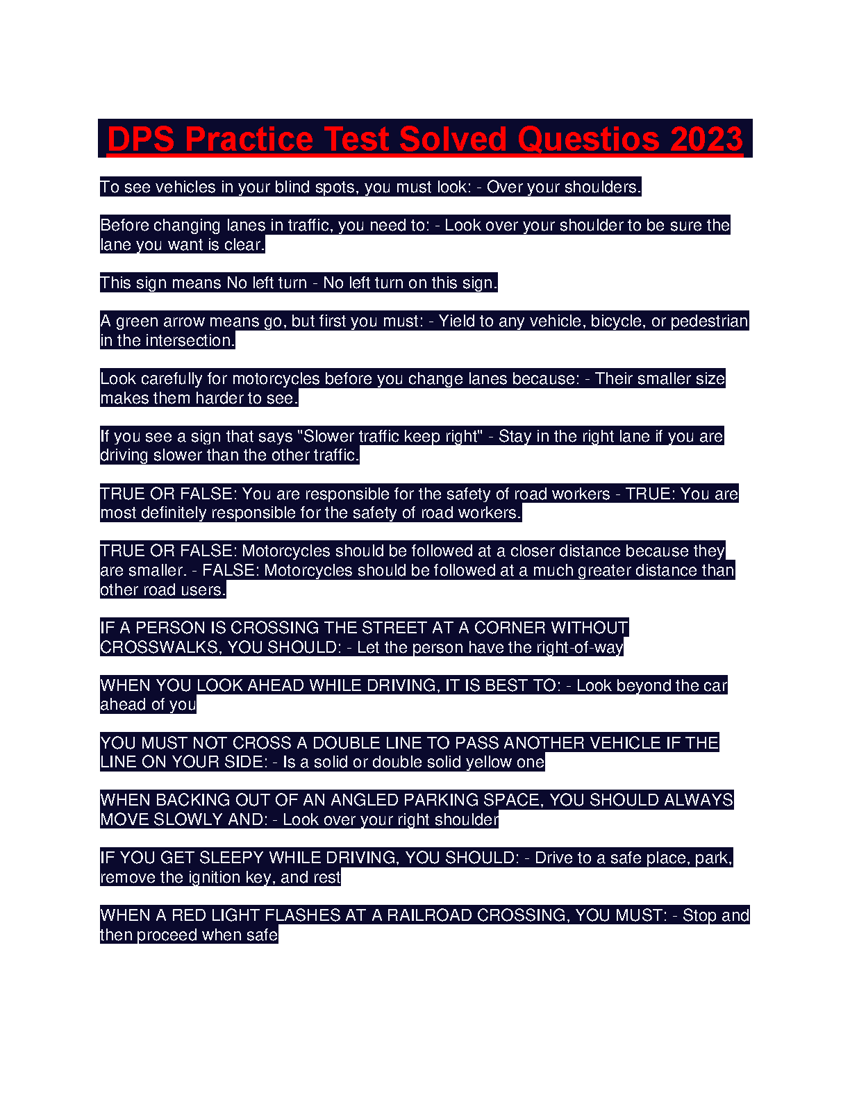 This resource covers the most important driving test questions with detailed answers and explanations, enabling you to confidently pass your DPS driving exam on your first try. This guide includes real-world scenarios, common driving rules, and traffic laws, ensuring a thorough understanding of safe driving practices.