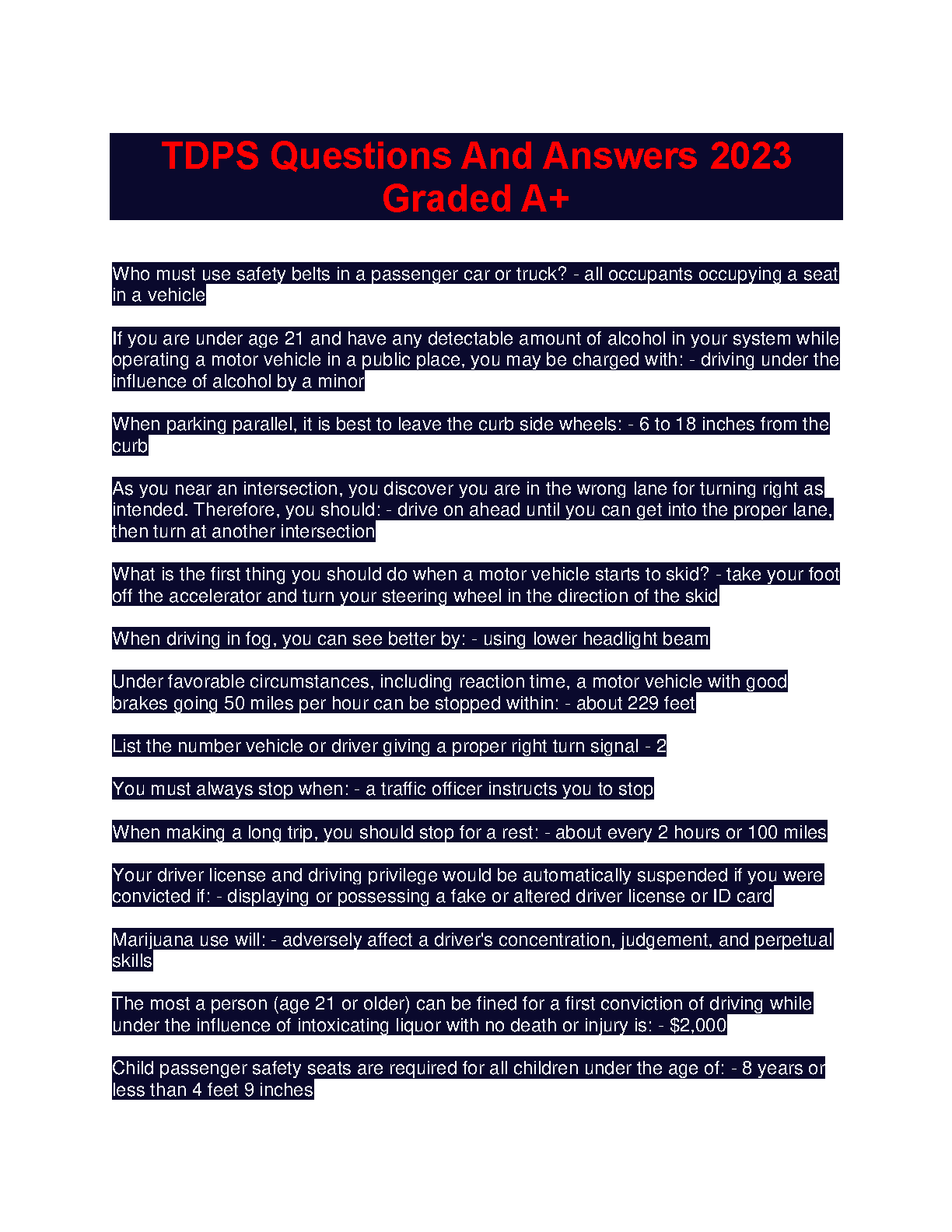 TDPS Questions and Answers 2023 Graded A+ is a comprehensive study guide for students preparing for the TDPS exam. This resource covers all the key topics and concepts to help you ace the exam on your first attempt and avoid resits.