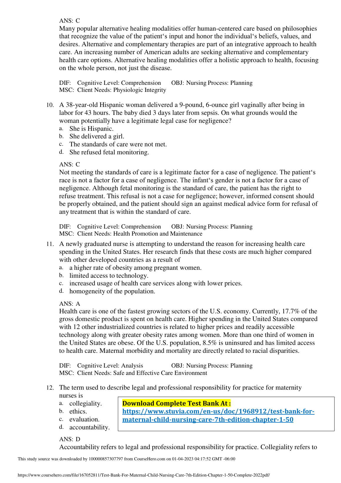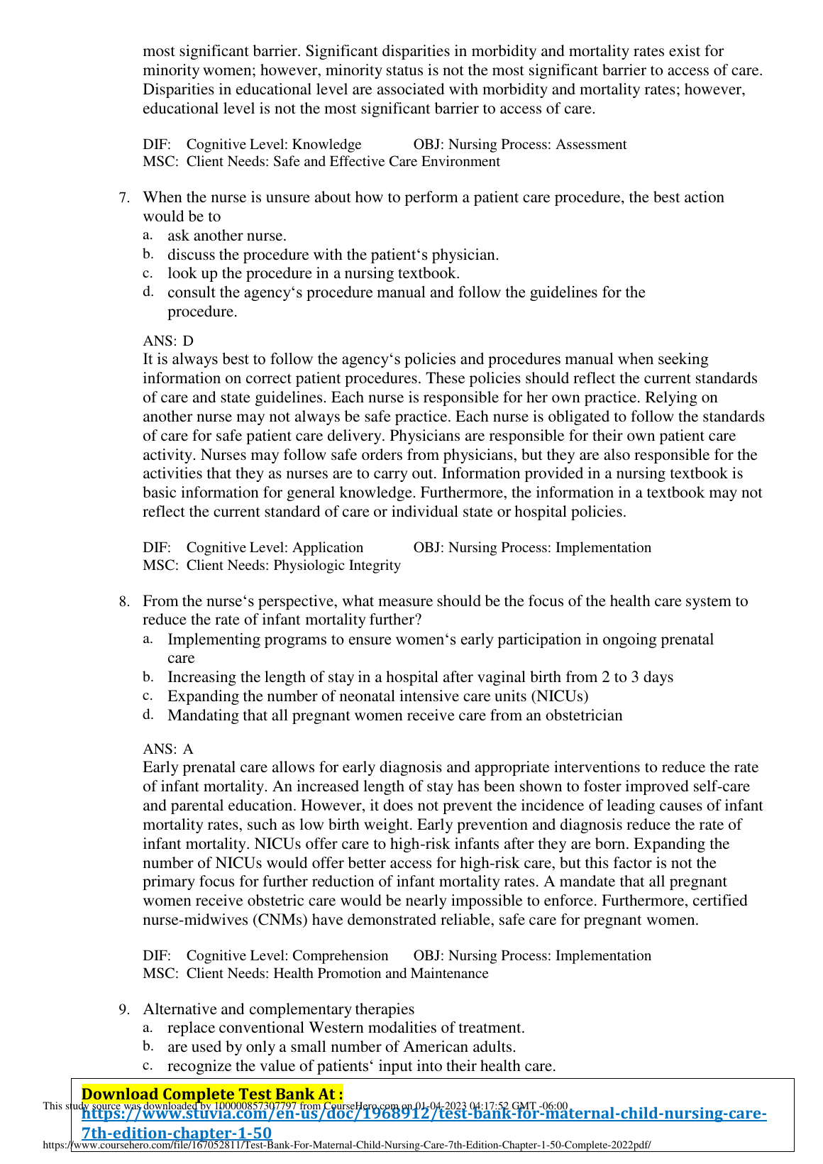 Maternal Child Nursing Care 7th Edition Test Bank by Perry, Cashion, Alden, Olshansky, Lowdermilk, Hockenberry