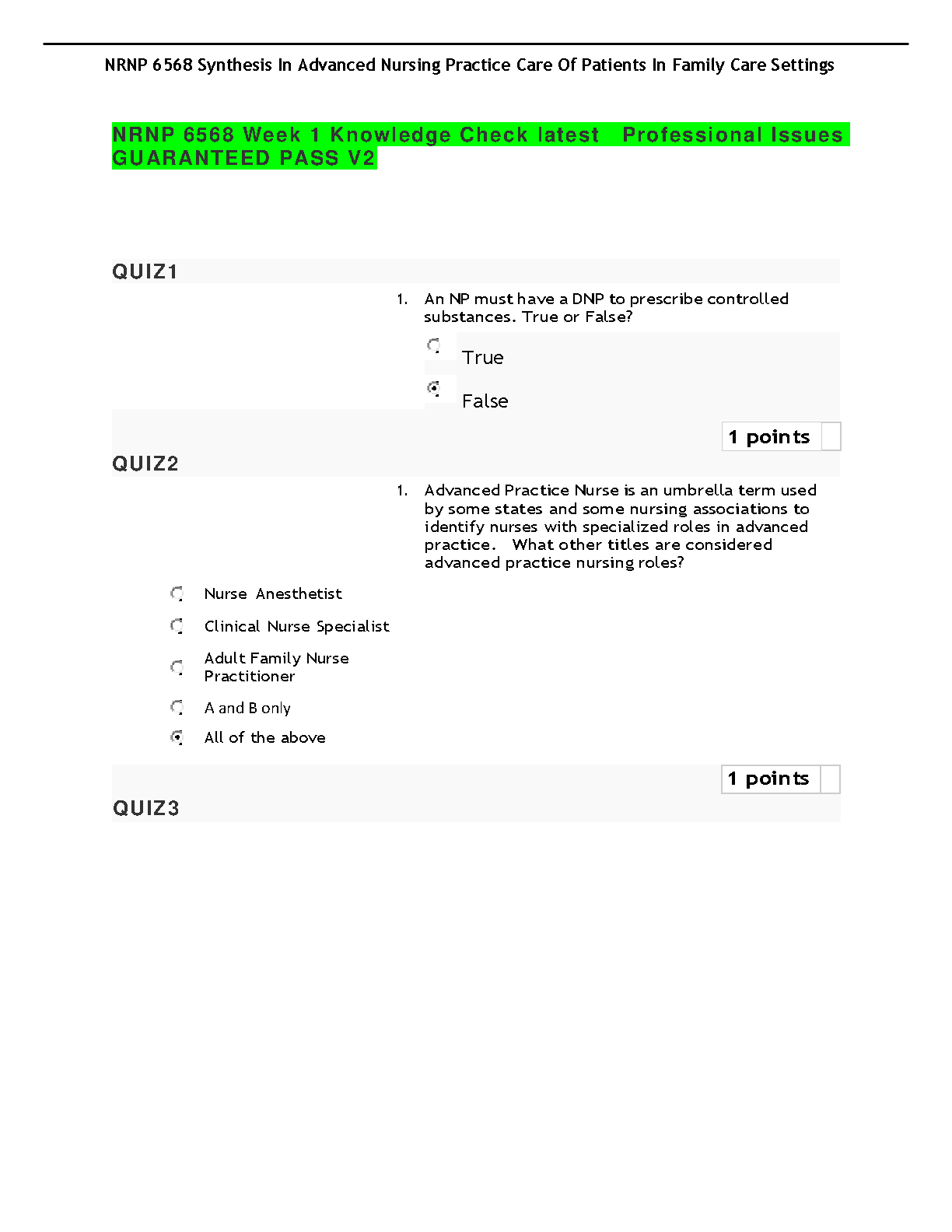 NRNP 6568 Week 1 Knowledge Check Latest Edition: Guaranteed Pass V2: Synthesis in Advanced Nursing Practice Care of Patients in Family Care Settings - [Author Names]