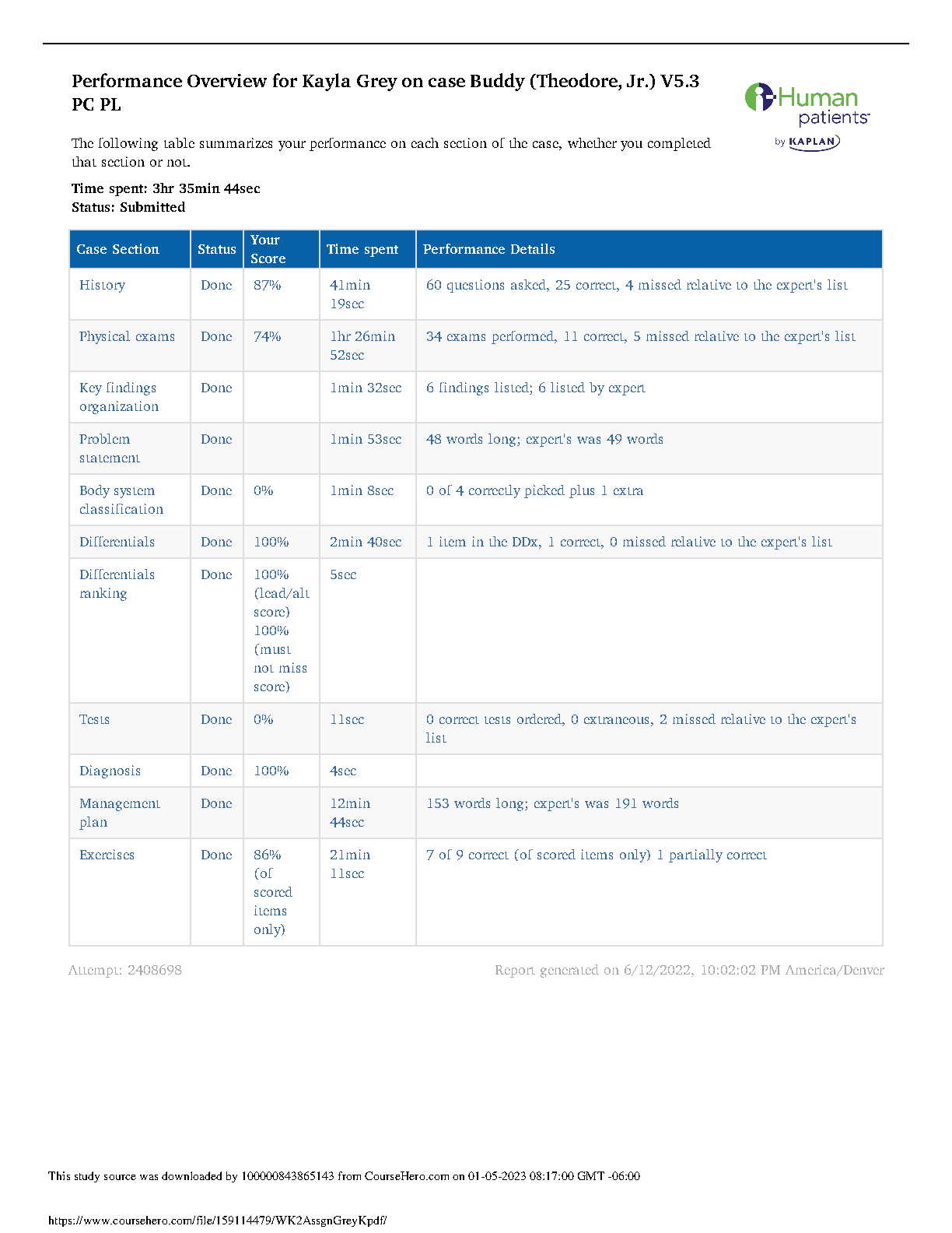 This iHuman case study report provides a detailed analysis of Kayla Grey's performance on the Buddy (Theodore), Jr. V5.3 case. The report covers each section of the case, including history, physical exams, key findings, problem statement, body system classification, differentials, diagnosis, management plan, and exercises. This resource provides a comprehensive overview of Kayla Grey's strengths and weaknesses, offering valuable insights for students preparing for clinical simulation exams.