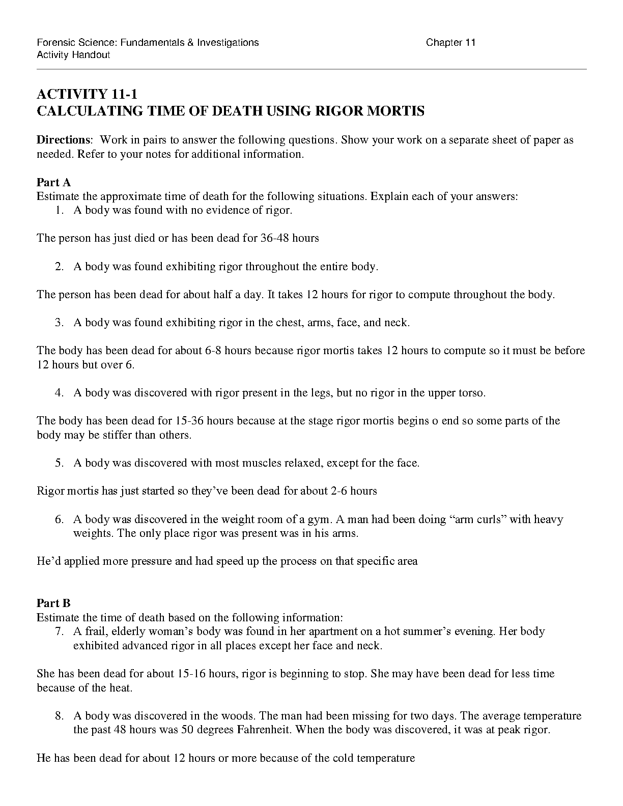 Learn to calculate the time of death using rigor mortis with this engaging activity handout. This resource provides real-world scenarios and explanations to help you master this vital forensic science concept. Perfect for students and professionals!