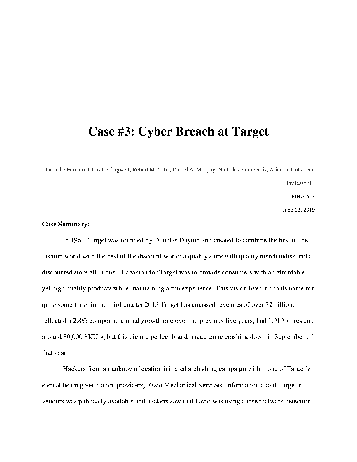 Case Study: Cyber Breach at Target by Danielle Furtado, Chris Leffingwell, Robert McCabe, Daniel A. Murphy, Nicholas Stamboulis, Arianna Thibodeau