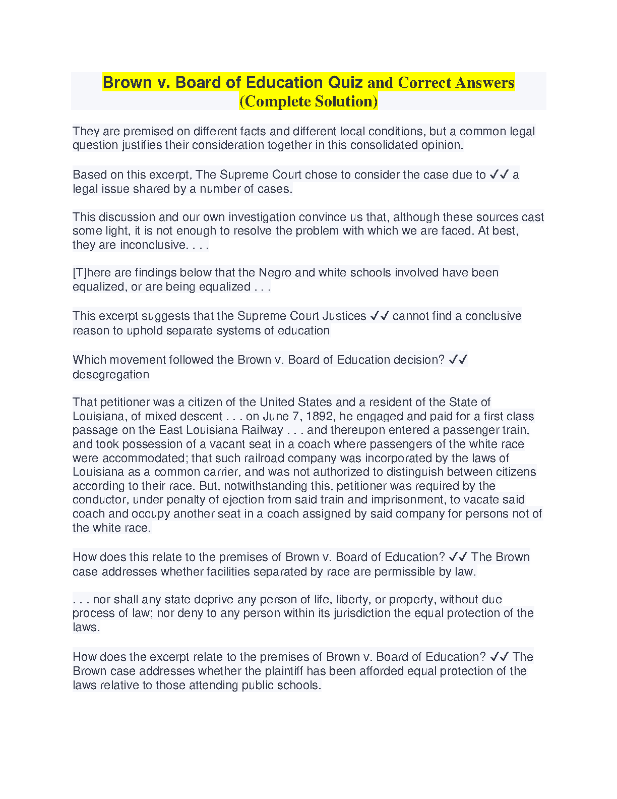 Brown v. Board of Education Quiz and Correct Answers (Complete Solution) - 2024/2025 Edition - By Warren E. Burger, Hugo L. Black, William J. Brennan Jr., Potter Stewart, Byron White, Thurgood Marshall