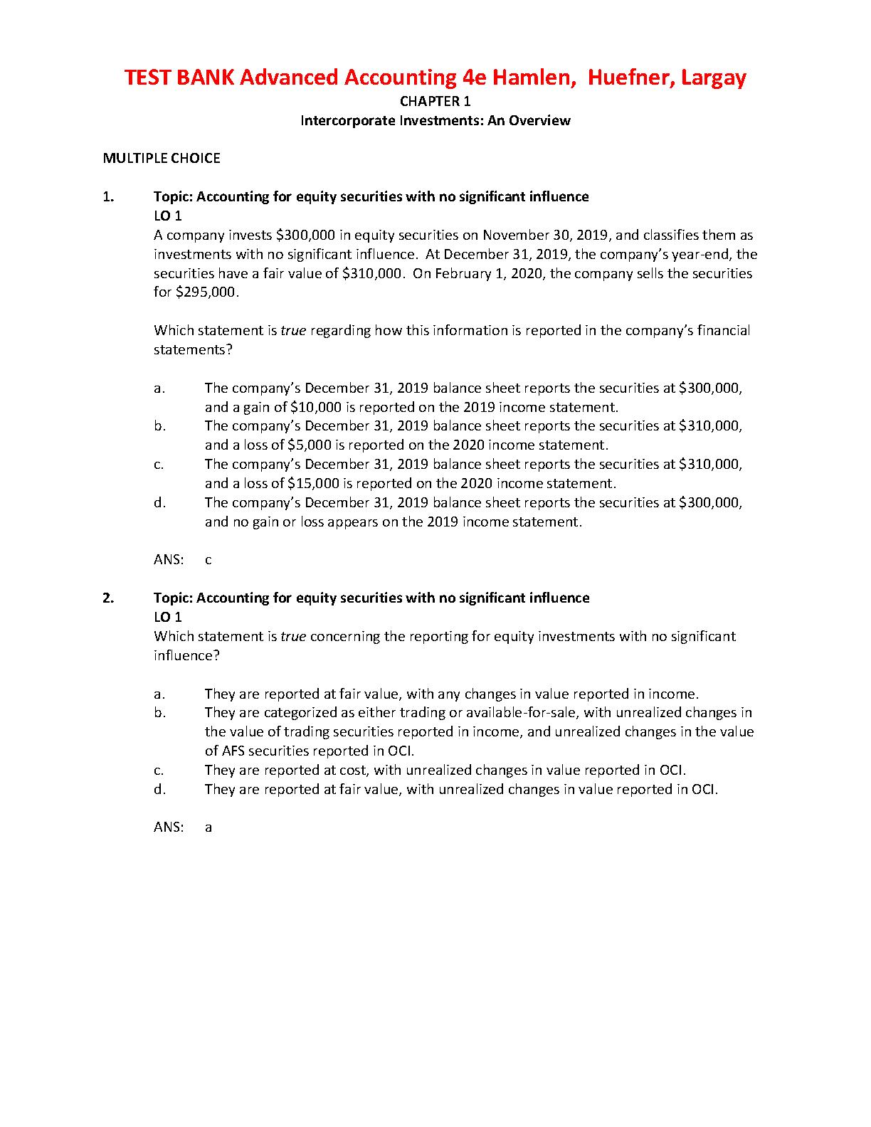 Advanced Accounting 4e Test Bank by Hamlen, Huefner, and Largay