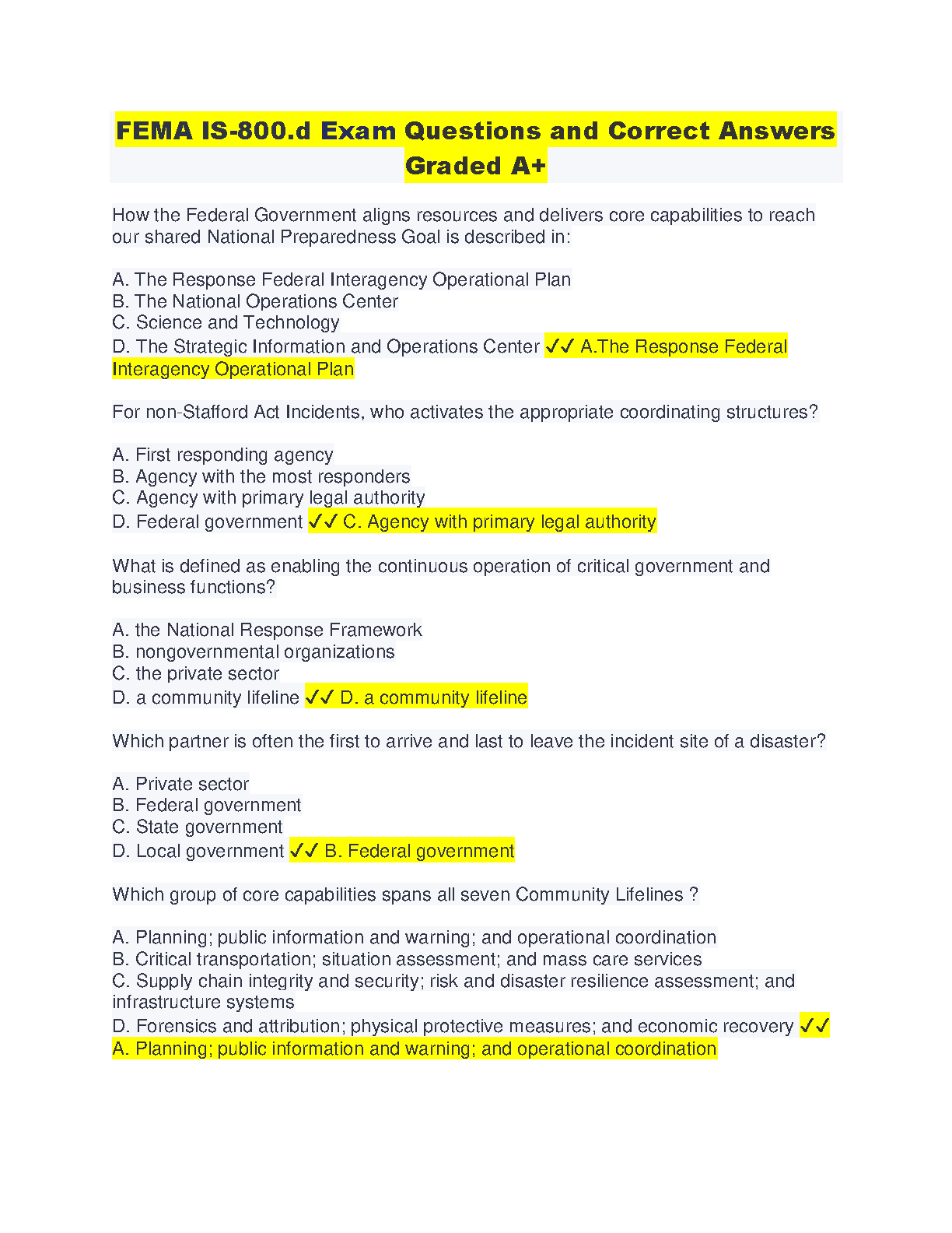 This resource provides a comprehensive set of FEMA IS-800.d exam questions and answers, graded A+ to help you ace your exam on the first attempt and avoid resits. Get prepared with this valuable learning tool that covers all the essential concepts.