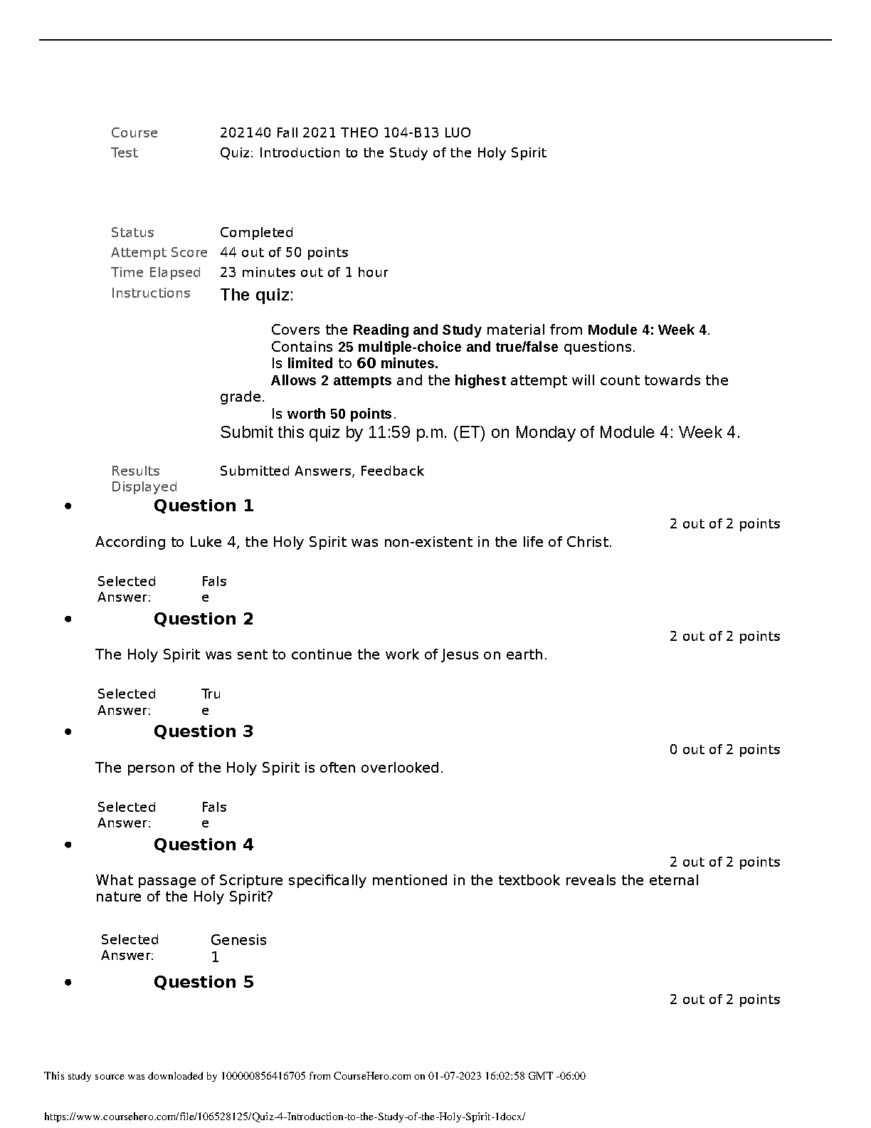 Introduction to the Study of the Holy Spirit Quiz 2024/2025 Edition by Dr. Luo