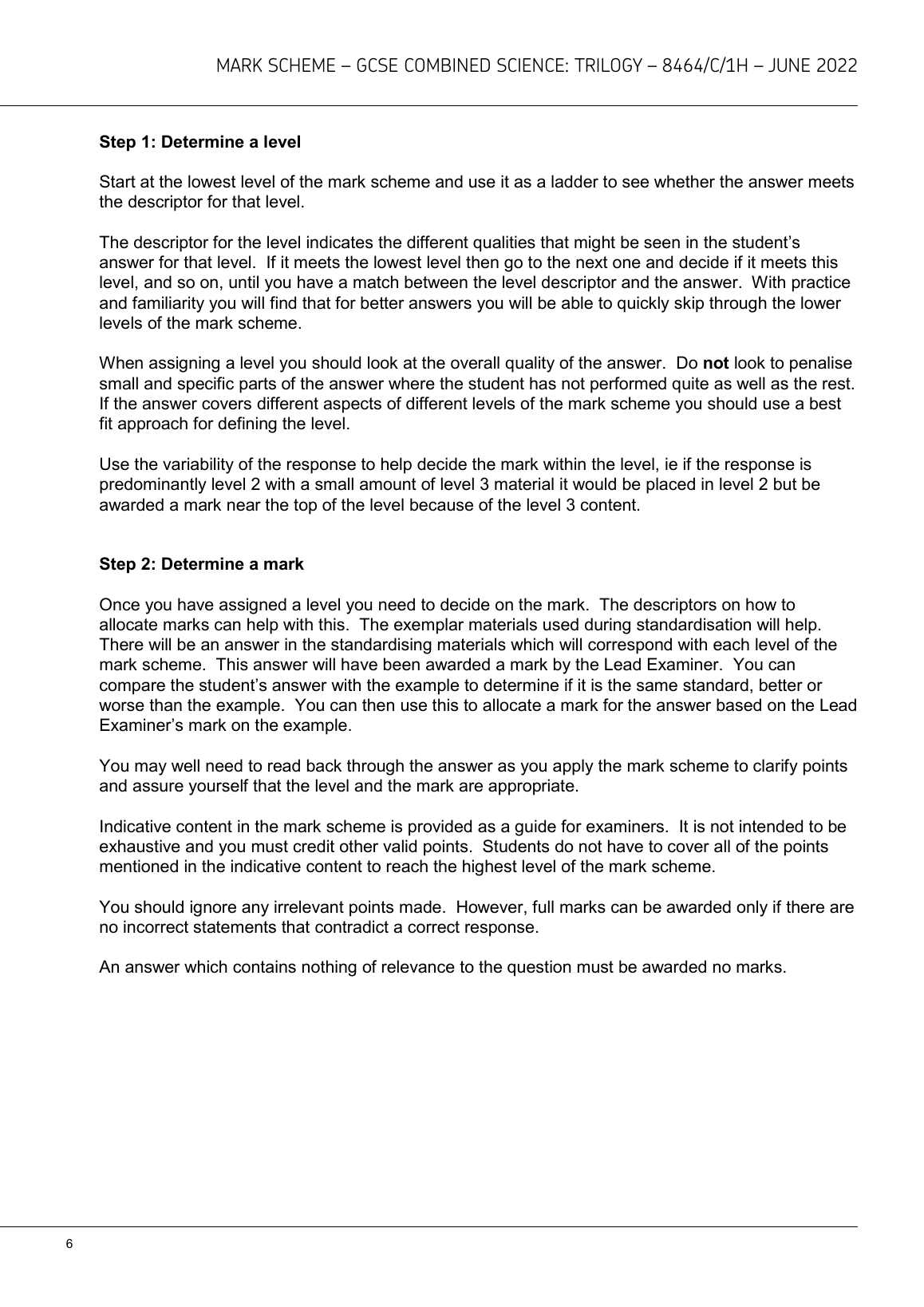 AQA GCSE COMBINED SCIENCE: TRILOGY PAPER 1H JUNE 2022 MARK SCHEME (8464/C/1H: Higher Tier Chemistry Paper 1H)