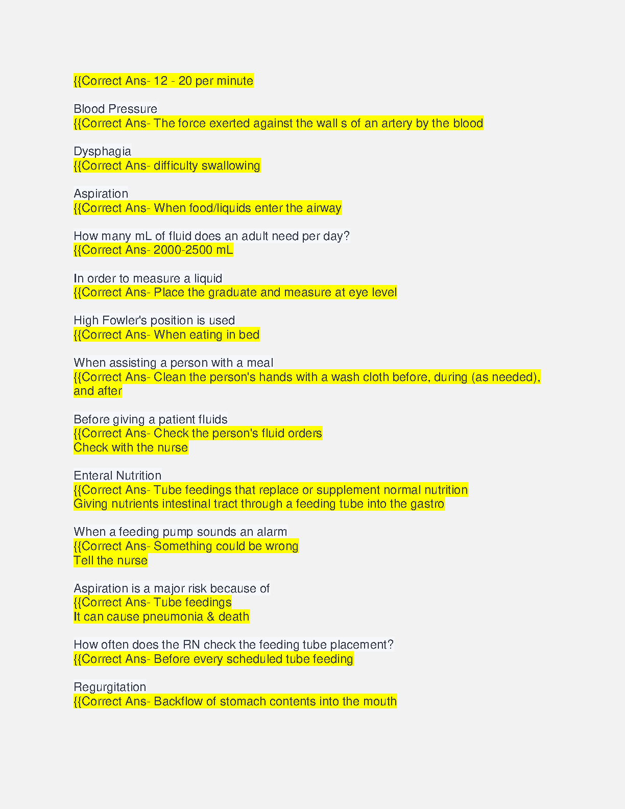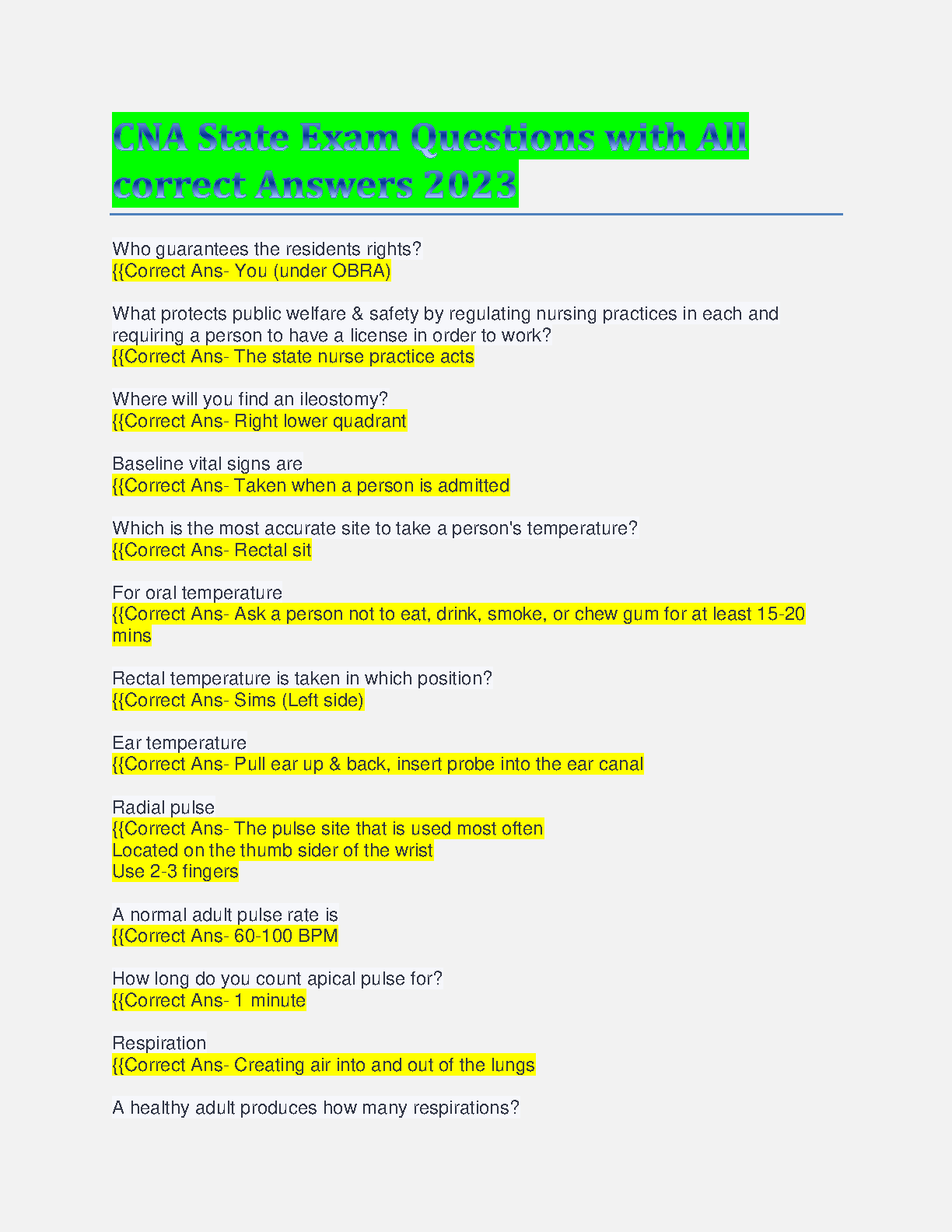 This resource contains a compilation of CNA state exam questions with their respective correct answers. It covers essential topics such as residents' rights, safety measures, vital signs, and temperature taking. This resource is perfect for students preparing for the CNA exam and aiming to pass on their first attempt.