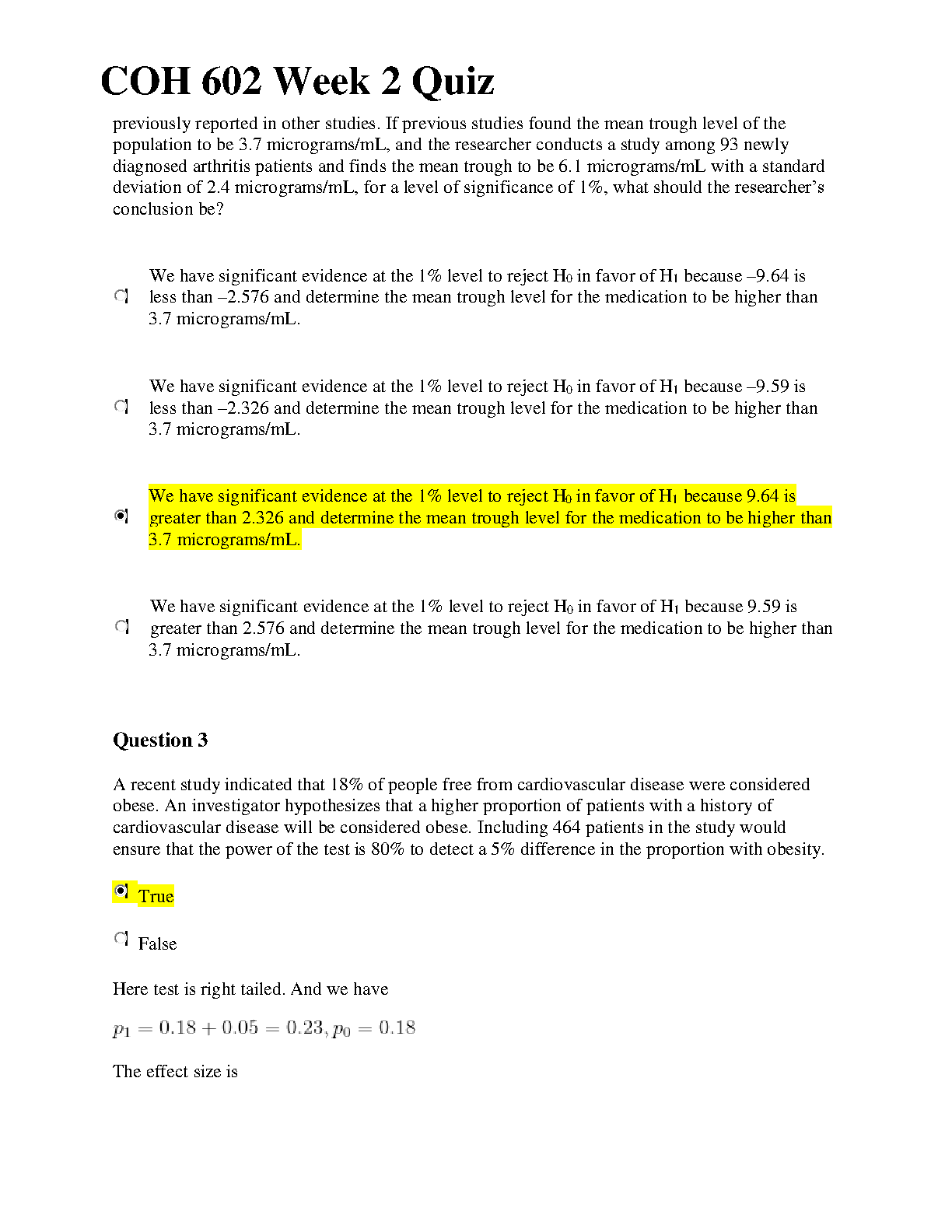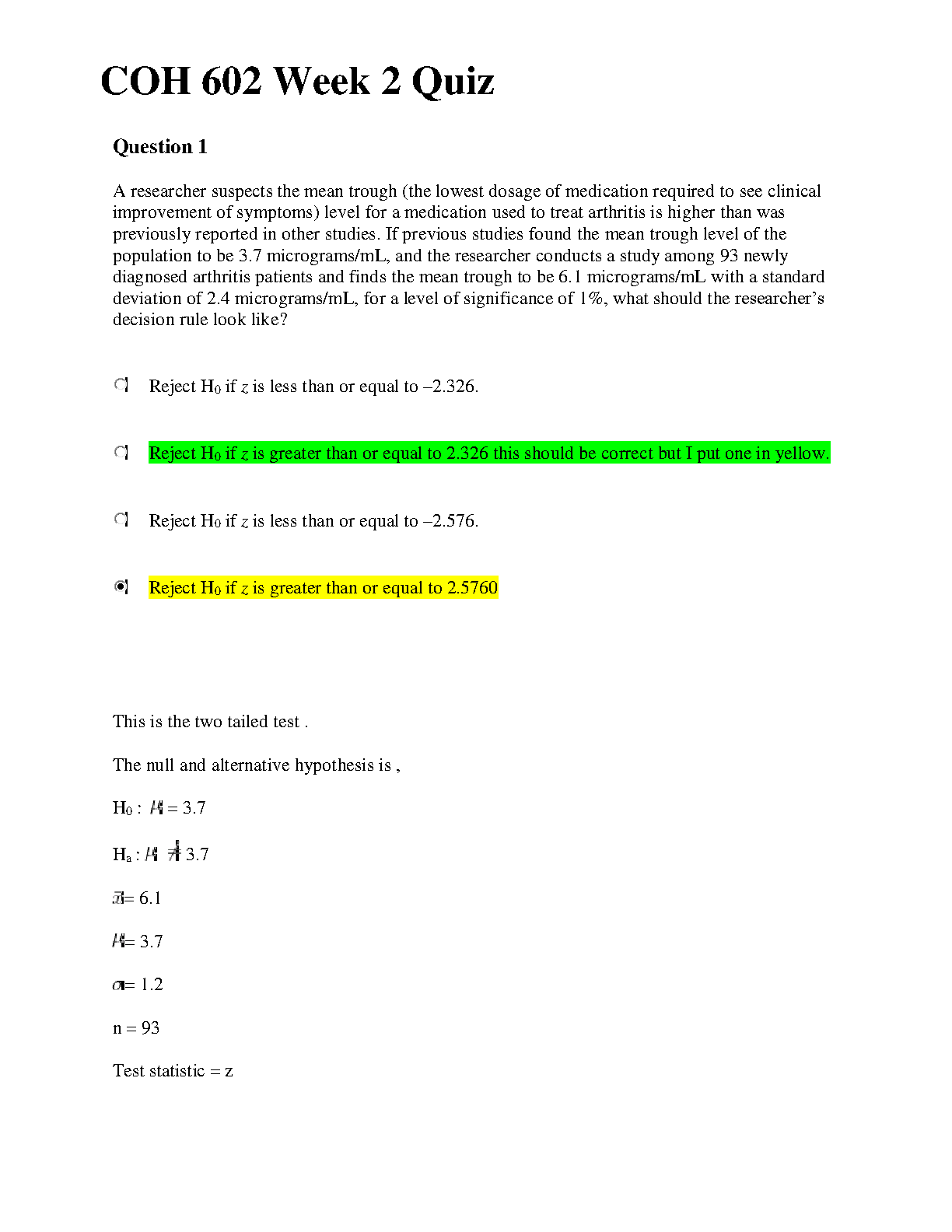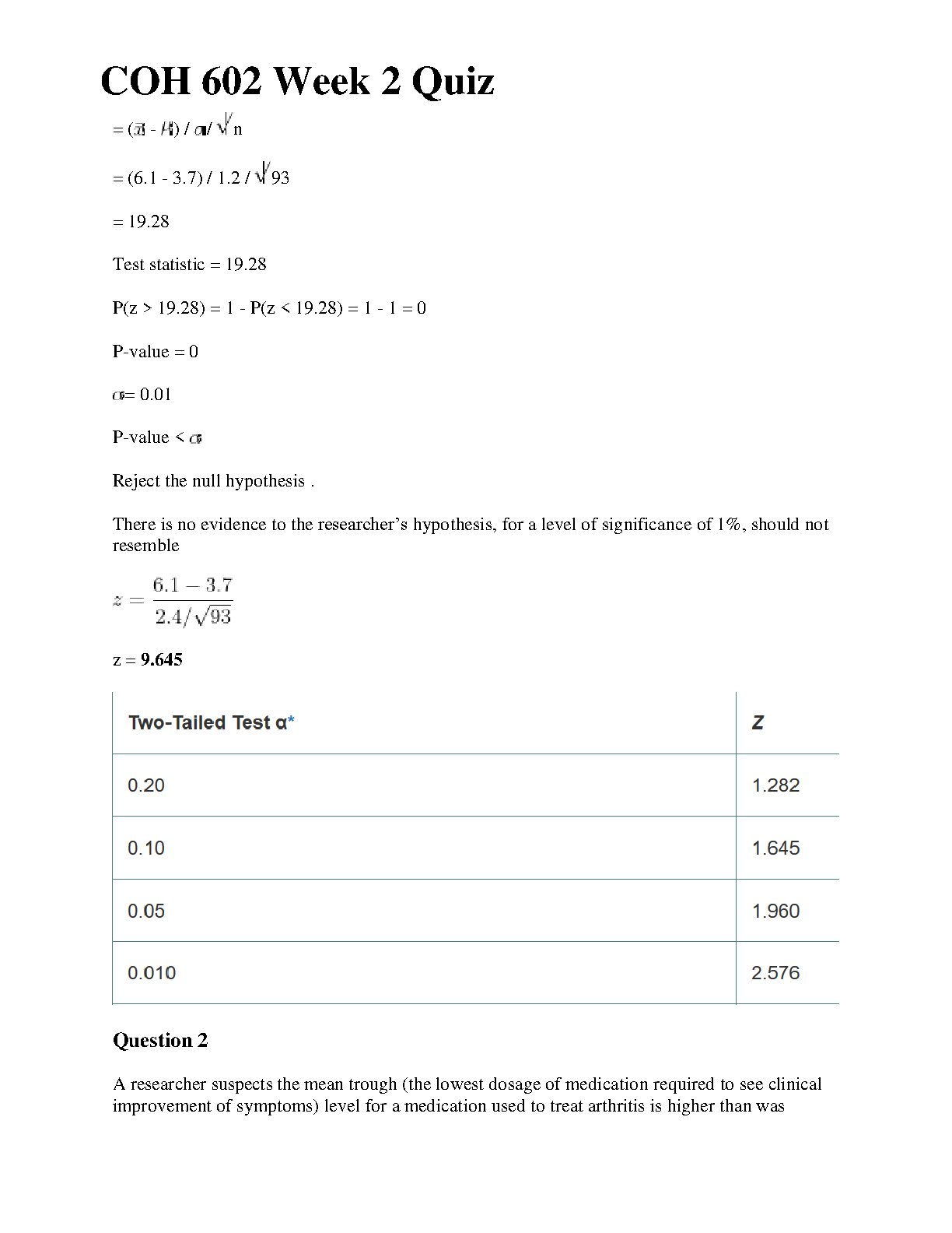 COH 602 Week 2 Quiz: Mastering Hypothesis Testing for Effective Decision Making