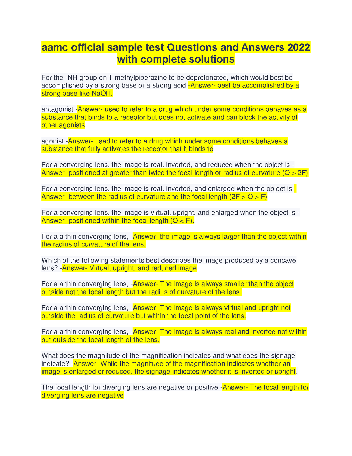 This resource contains AAMC Official Sample Test Questions and Answers 2022 with Complete Solutions. This is an excellent resource for students preparing for the AAMC exam as it provides practice questions and answers with complete solutions. This resource is designed to help students pass their exams on the first attempt and avoid resits.