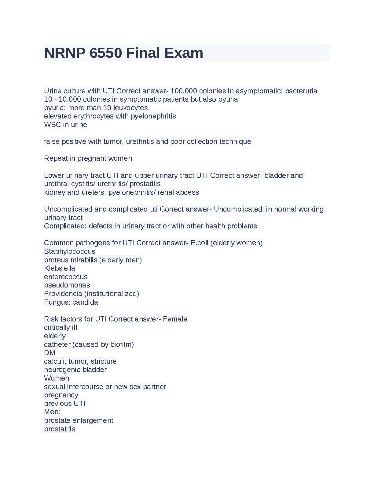 Ace your NRNP 6550 final exam with this comprehensive study guide. Covering key topics like UTI diagnosis, risk factors, and common pathogens, this resource will help you succeed on your first attempt.