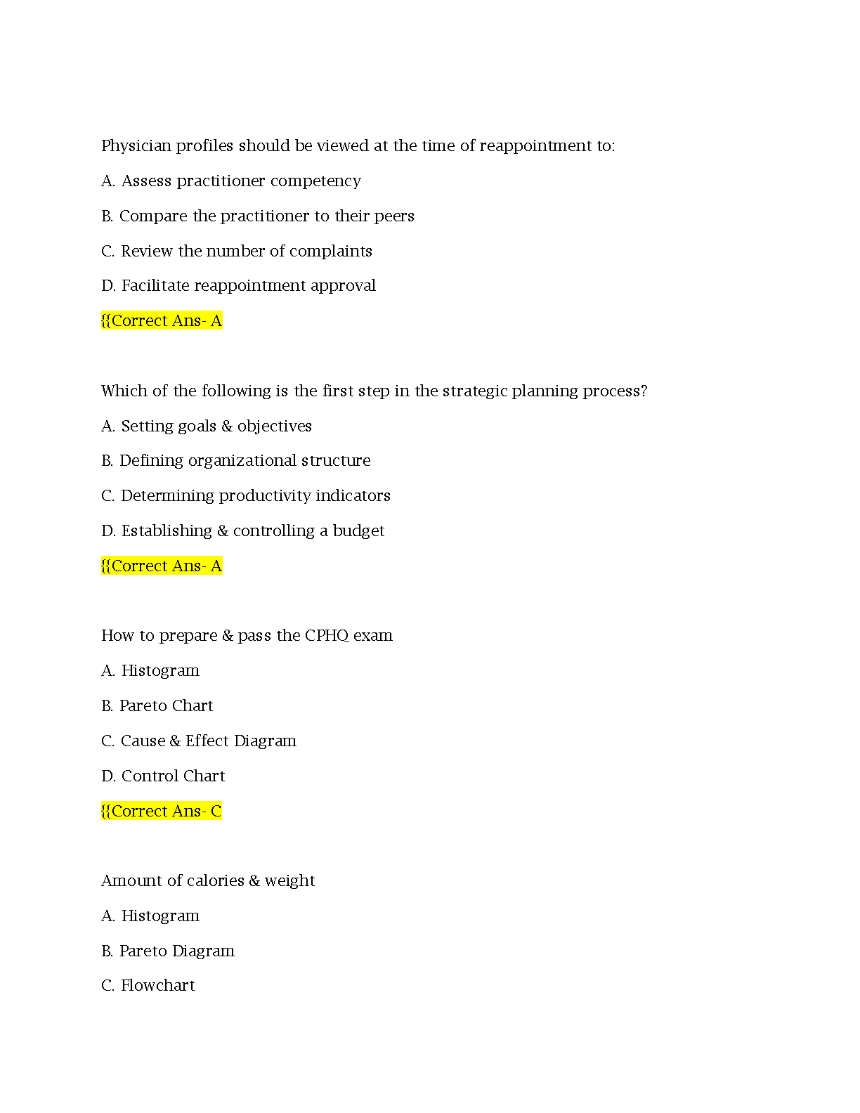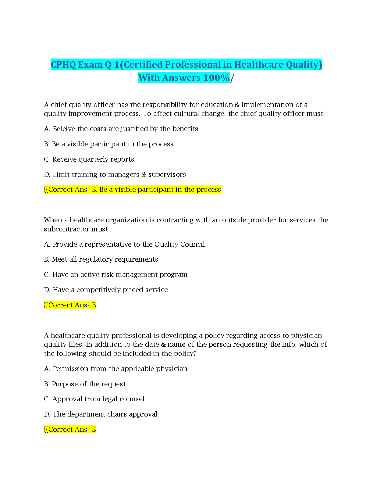 This resource contains practice questions and answers for the CPHQ Exam Q 1. It's designed to help students ace their exam on the first attempt and avoid resits.