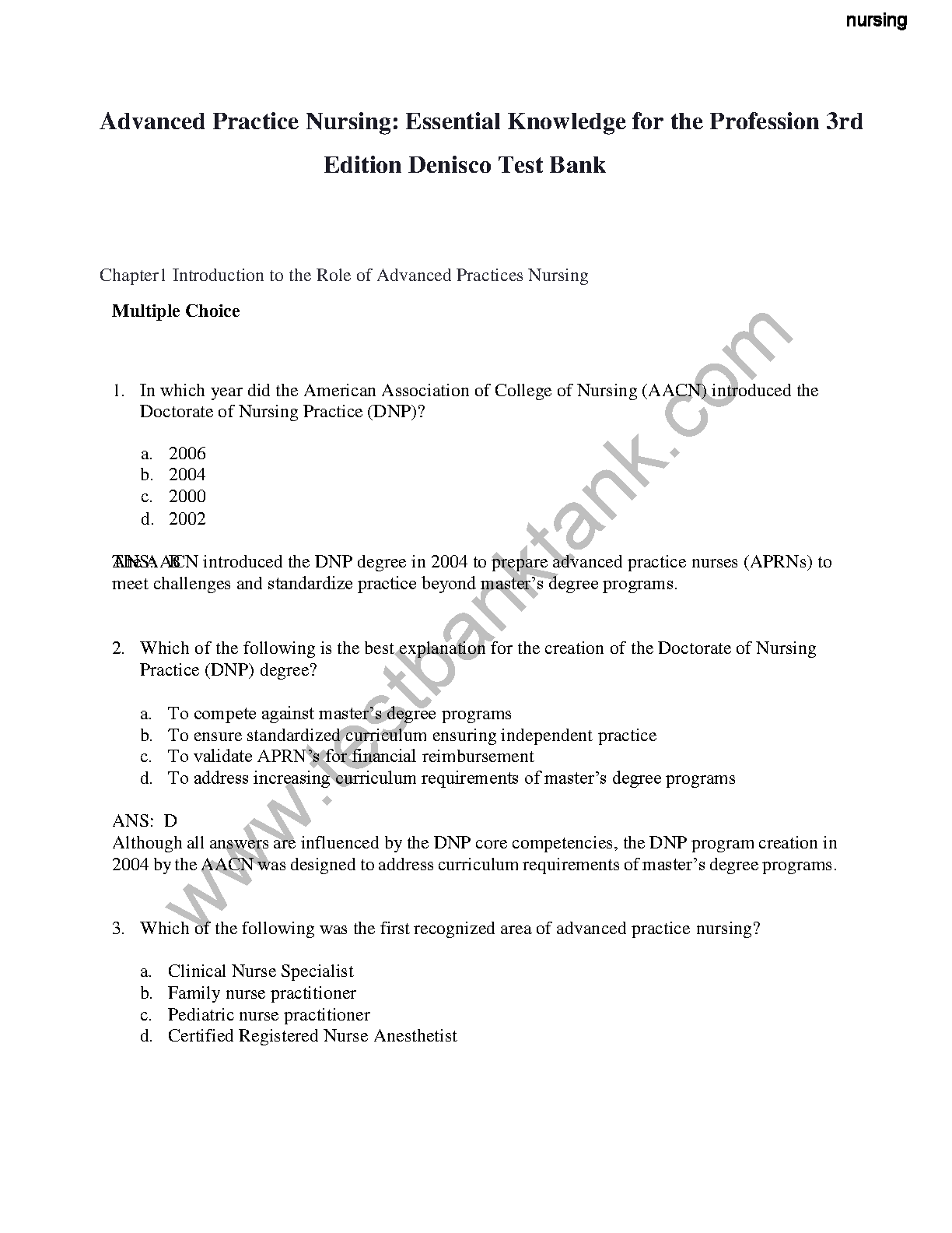Advanced Practice Nursing: Essential Knowledge for the Profession 3rd Edition by Denisco, Judith A., et al. Test Bank