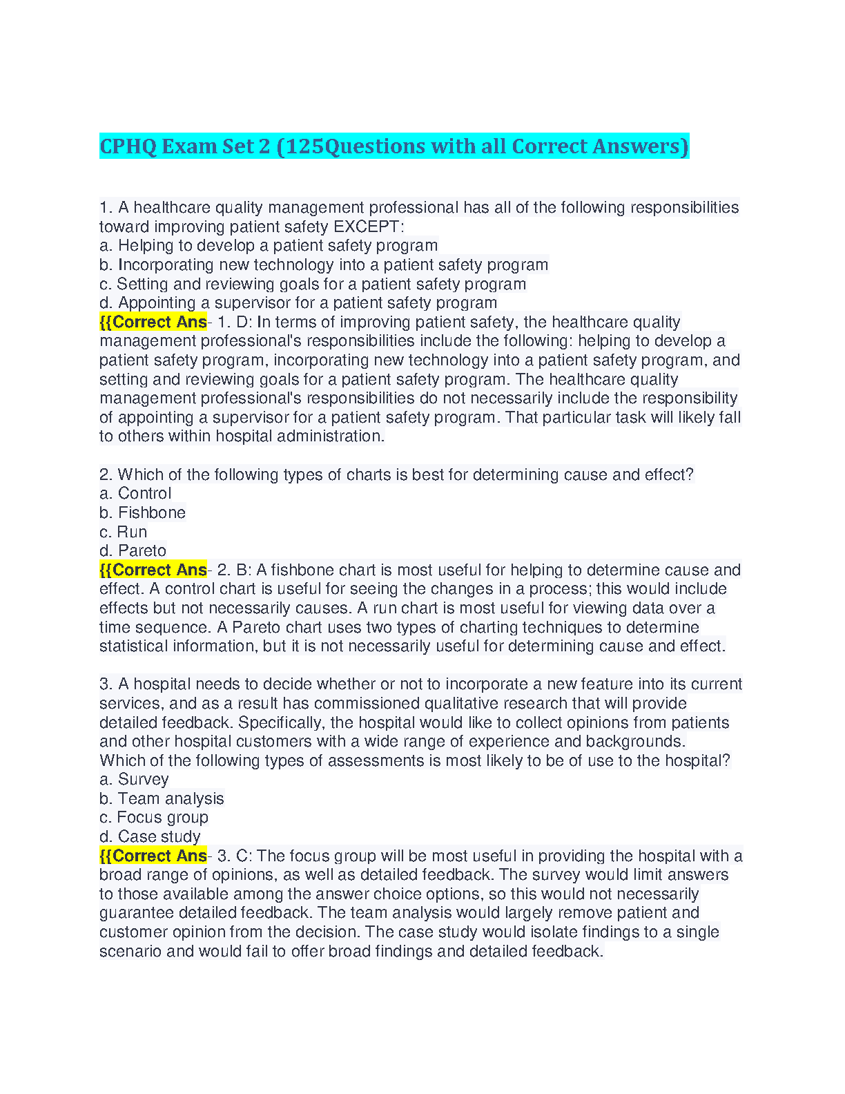 CPHQ Exam Set 2 (125 Questions with all Correct Answers) - Latest Edition for Passing the Exam on Your First Attempt