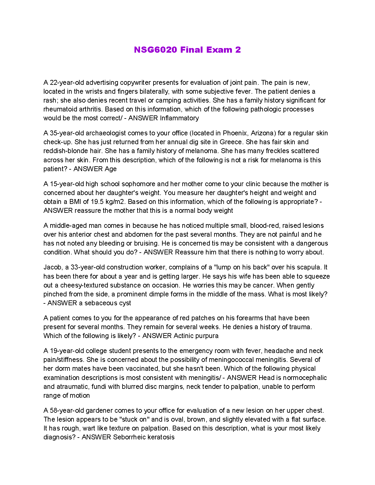 Get ready for success in your NSG6020 course with this comprehensive and up-to-date final exam resource. Our team of expert instructors has crafted a series of challenging questions designed to help you master the key concepts and prepare for your exams.