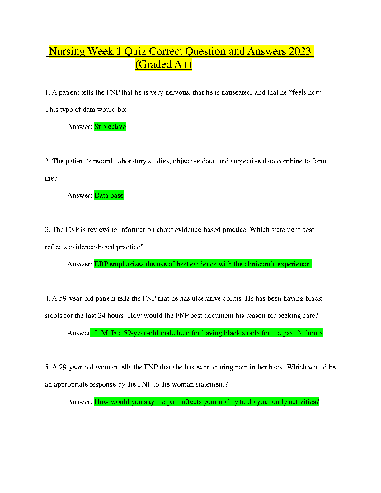 Nursing Week 1 Quiz Correct Question and Answers 2023 (Graded A )