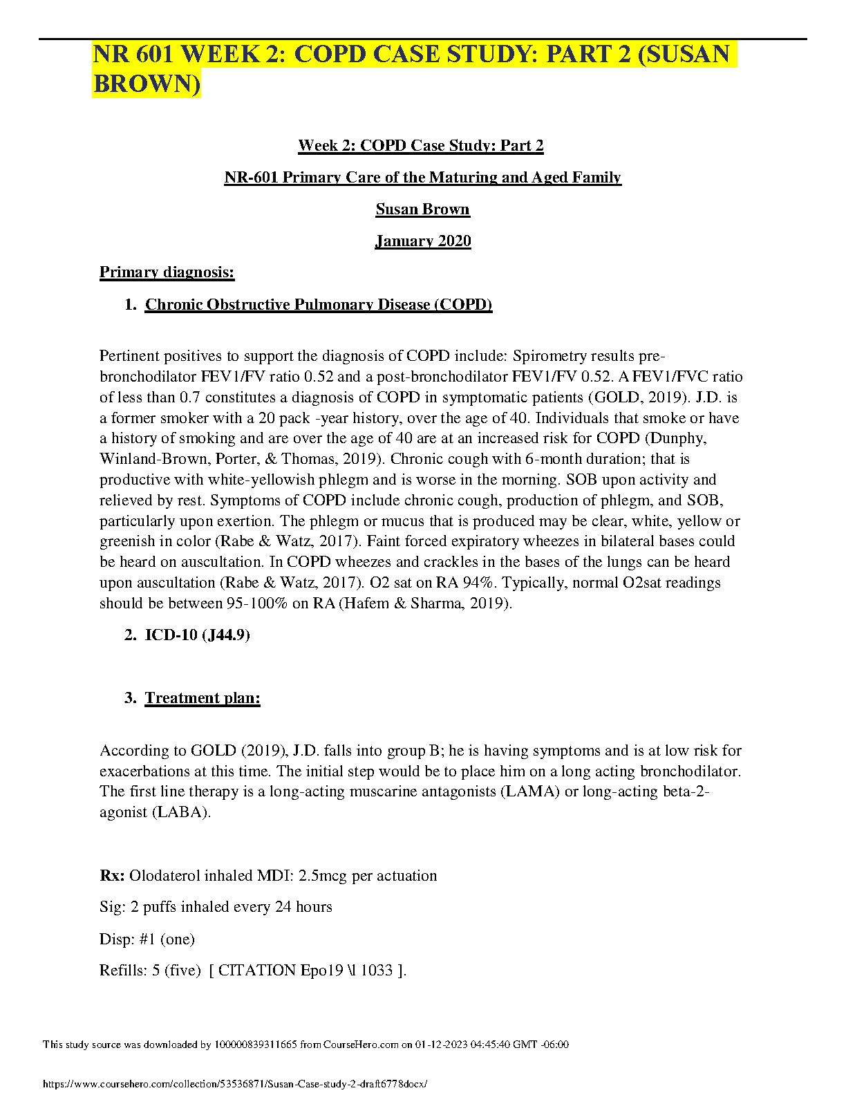 NR 601 Week 2: COPD Case Study: Part 2 (Susan Brown) - Primary Care of the Maturing and Aged Family - Latest Edition for 2024/2025 - Pass Your Exam on the First Attempt