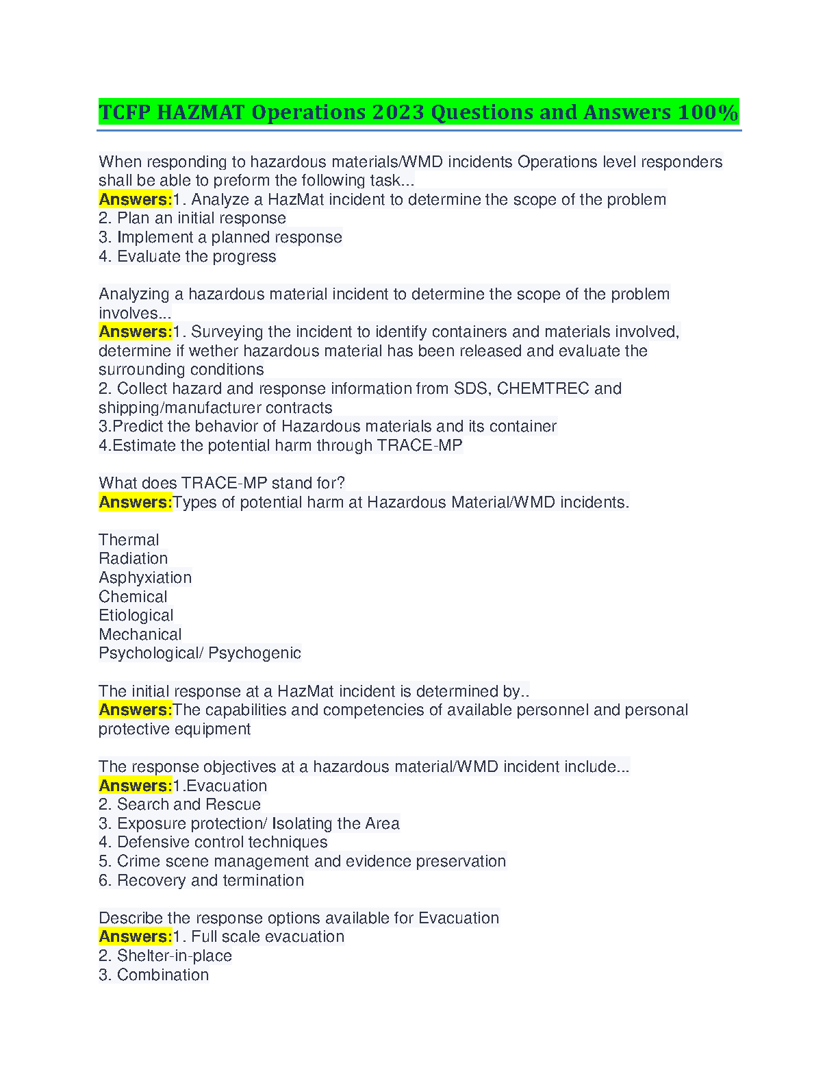 This resource provides a comprehensive set of questions and answers related to TCFP HAZMAT Operations 2023, covering various aspects of hazardous materials and WMD incidents. Perfect for students preparing for exams, this study material is designed to help you achieve a high score and avoid resits on your first attempt.