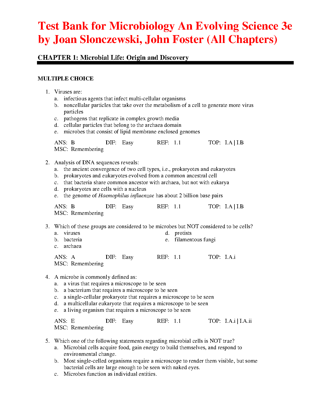 This test bank contains multiple-choice questions for all chapters of the book "Microbiology: An Evolving Science 3e" by Joan Slonczewski and John Foster.