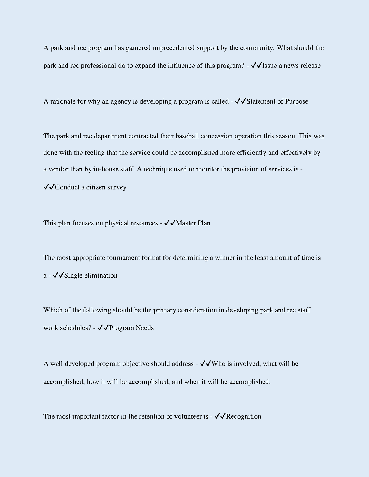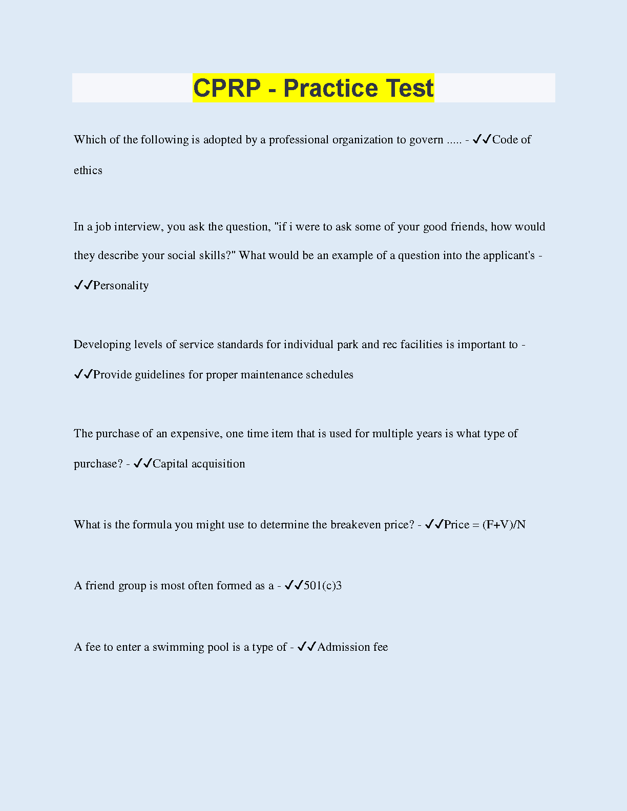 Get ready to ace your Certified Park & Recreation Professional (CPRP) exam with our comprehensive practice test! This resource includes numerous practice questions that closely mirror the actual exam, ensuring you're well-prepared for the real deal. Our questions cover all essential CPRP exam topics, helping you identify areas for improvement and boost your confidence. Start your journey toward becoming a Certified Park & Recreation Professional today!