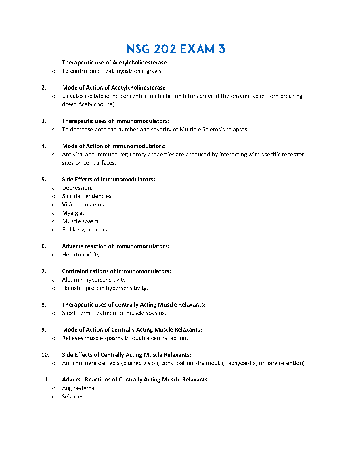 Aceytlcholinesterase, Immunomodulators, Muscle Relaxants NSG 202 Exam 3 study guide, Aceytlcholinesterase, Immunomodulators, Muscle Relaxants Study Guide, Aceytlcholinesterase, Immunomodulators, Muscle Relaxants Notes