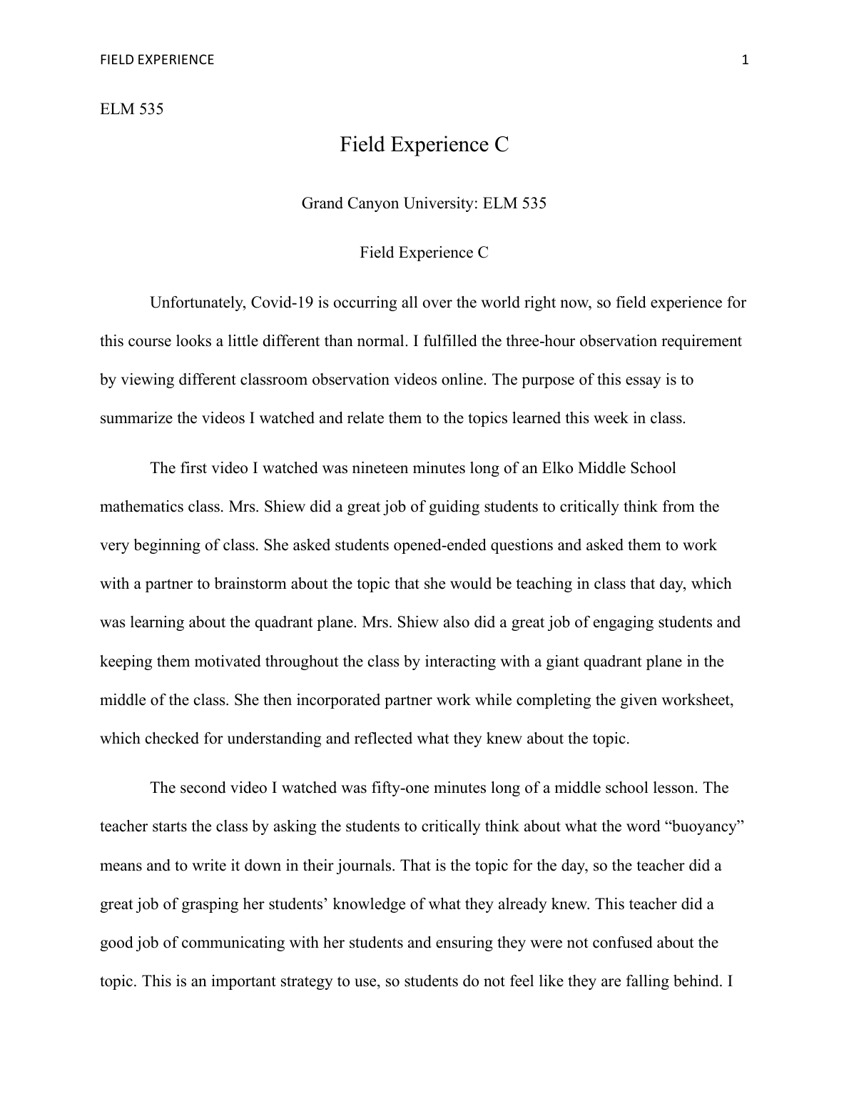 Field Experience C Grand Canyon University: ELM 535 Field Experience C OBSERVATION . DOWNLOAD on www.hackedexams.com INSTANTLY.