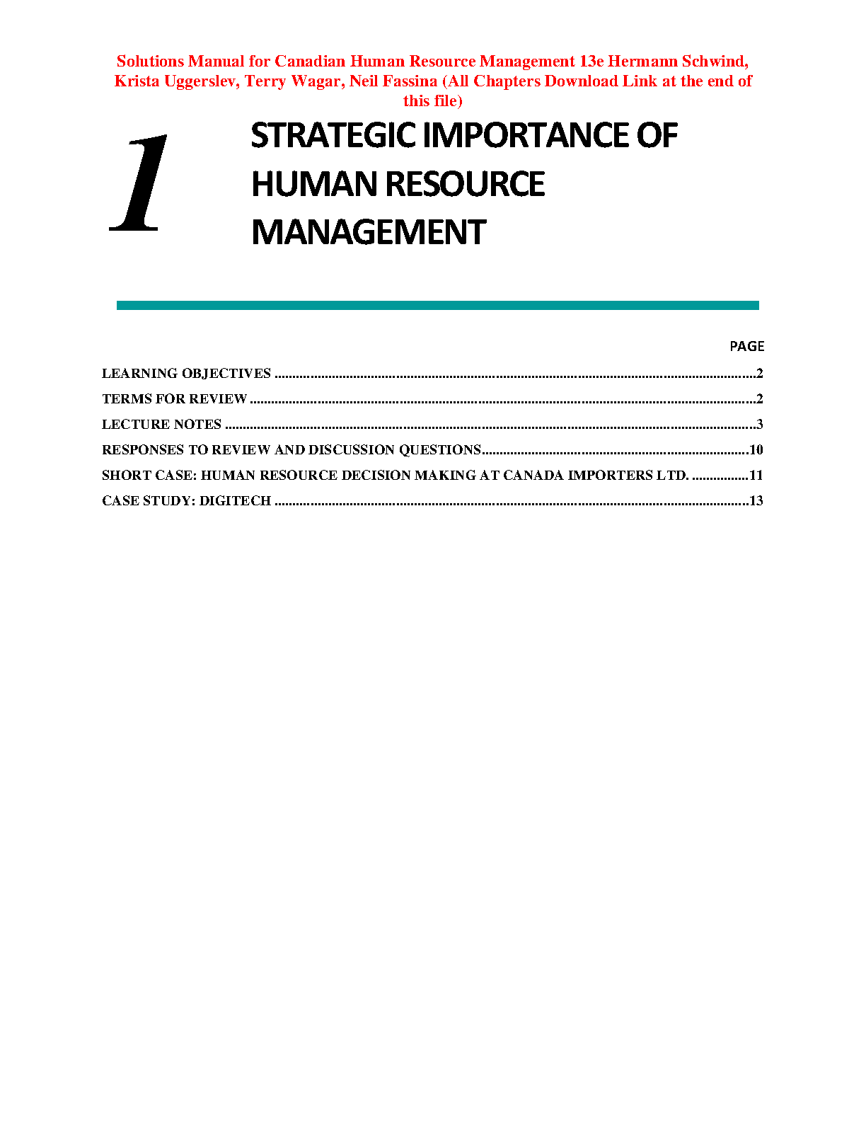 This Solutions Manual provides detailed answers to the end-of-chapter questions in Canadian Human Resource Management, 13th Edition. The manual includes a complete set of answers to all questions, along with explanations and insights to help students understand the concepts covered in the textbook. This is a great resource for students seeking to improve their comprehension of human resource management principles and practices.