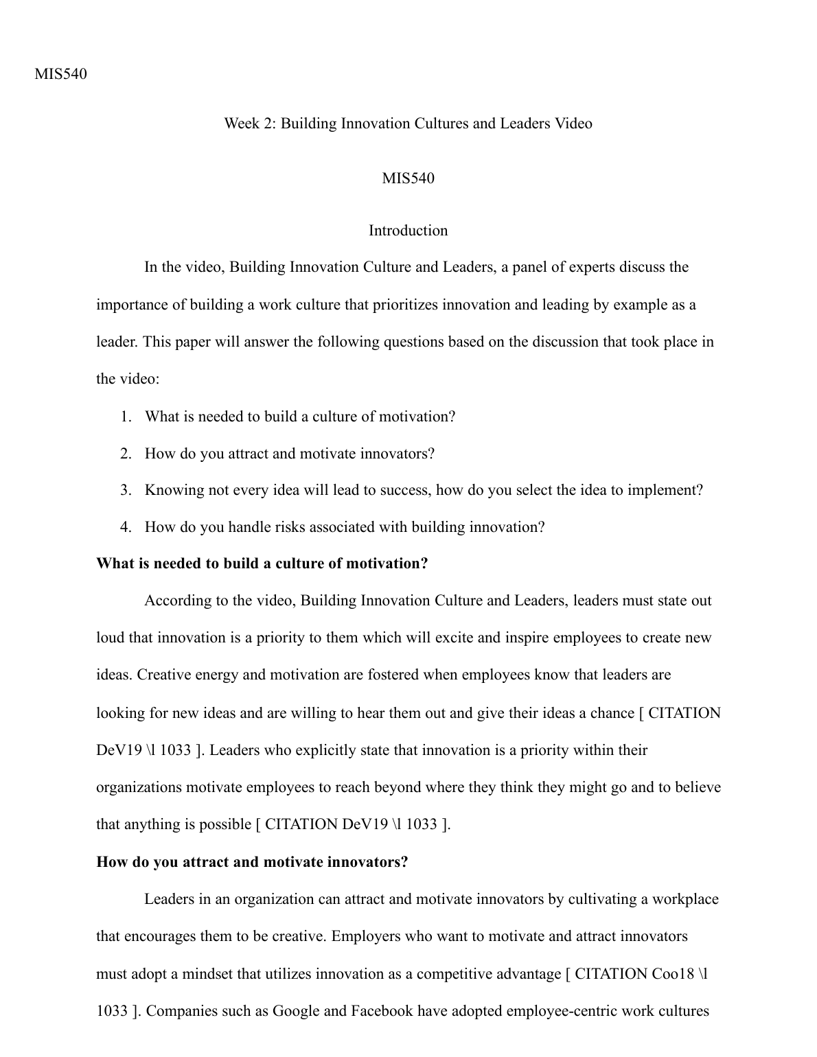 Week 2: Building Innovation Cultures and Leaders Video MIS540