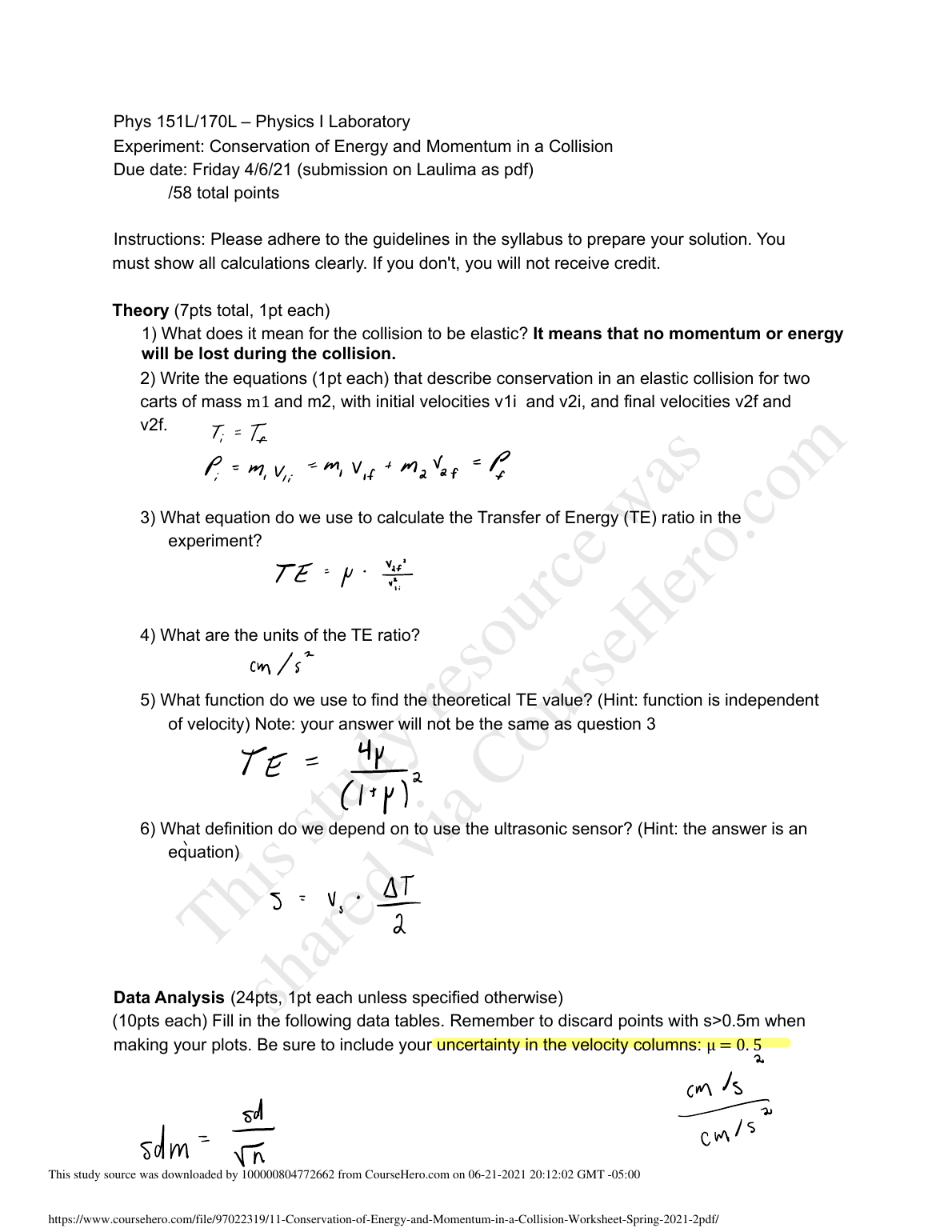 Phys 151L/170L – Physics I Laboratory Experiment: Conservation of Energy and Momentum in a Collision WITH CORRECT WORKINGS