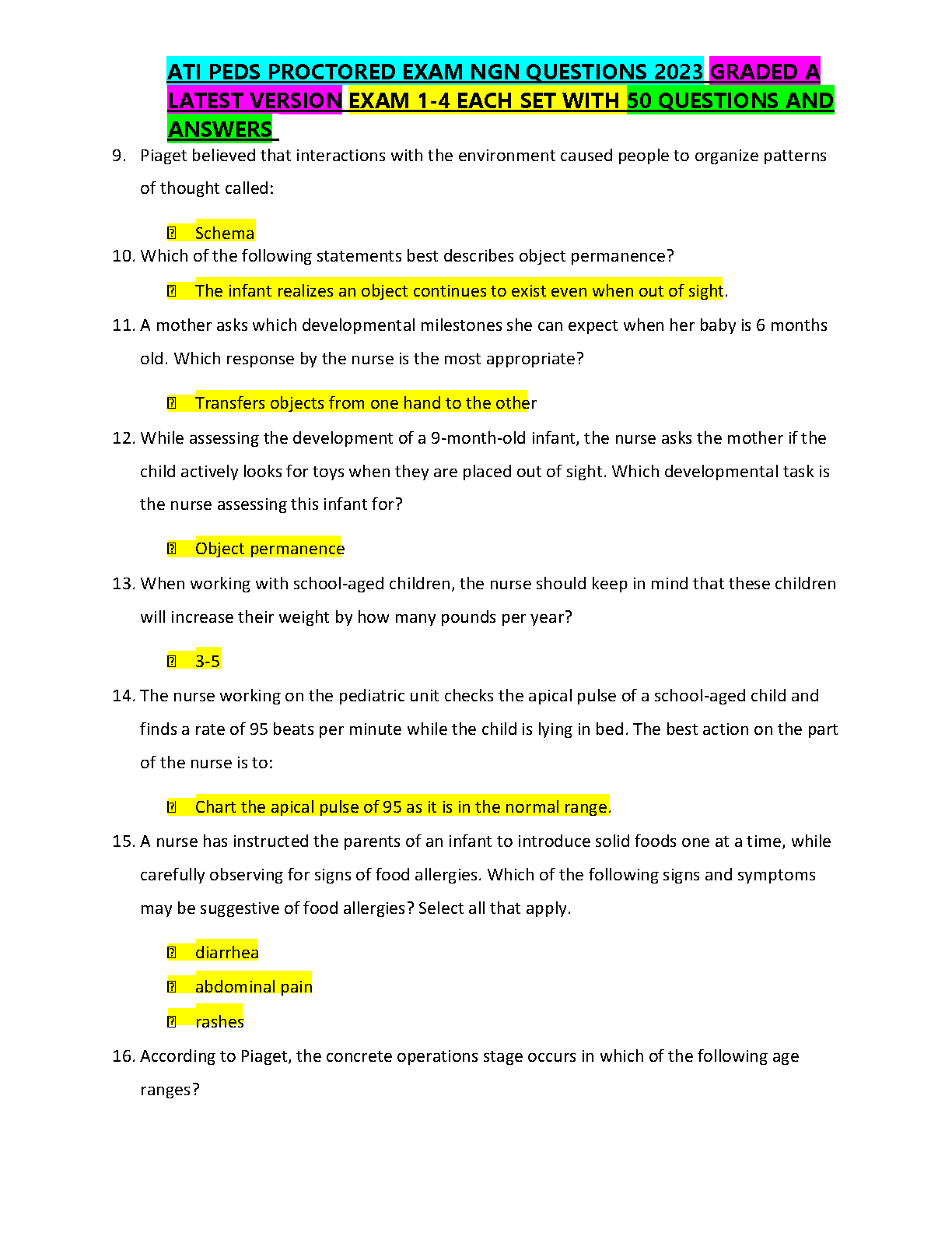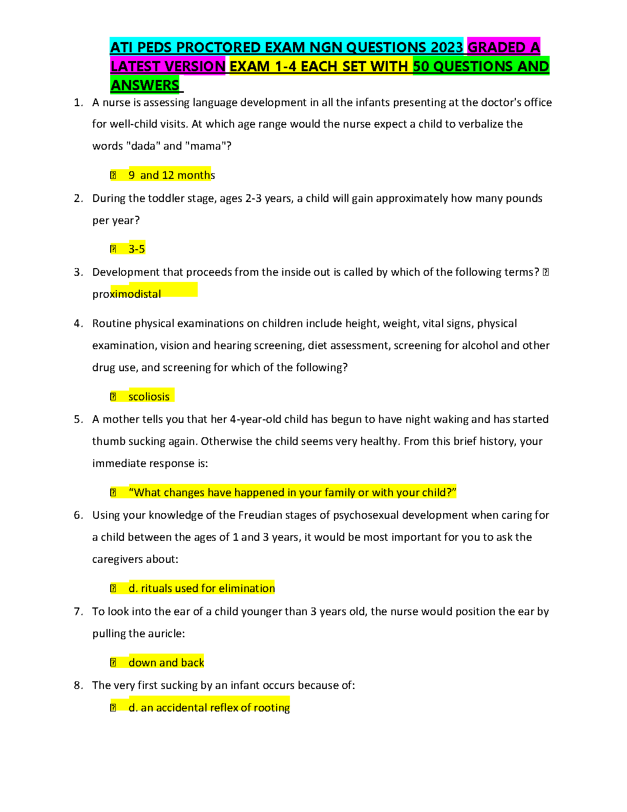 ATI Peds Proctored Exam NGN Questions 2023 Graded A Latest Version Exam 1-4 Each Set With 50 Questions and Answers
