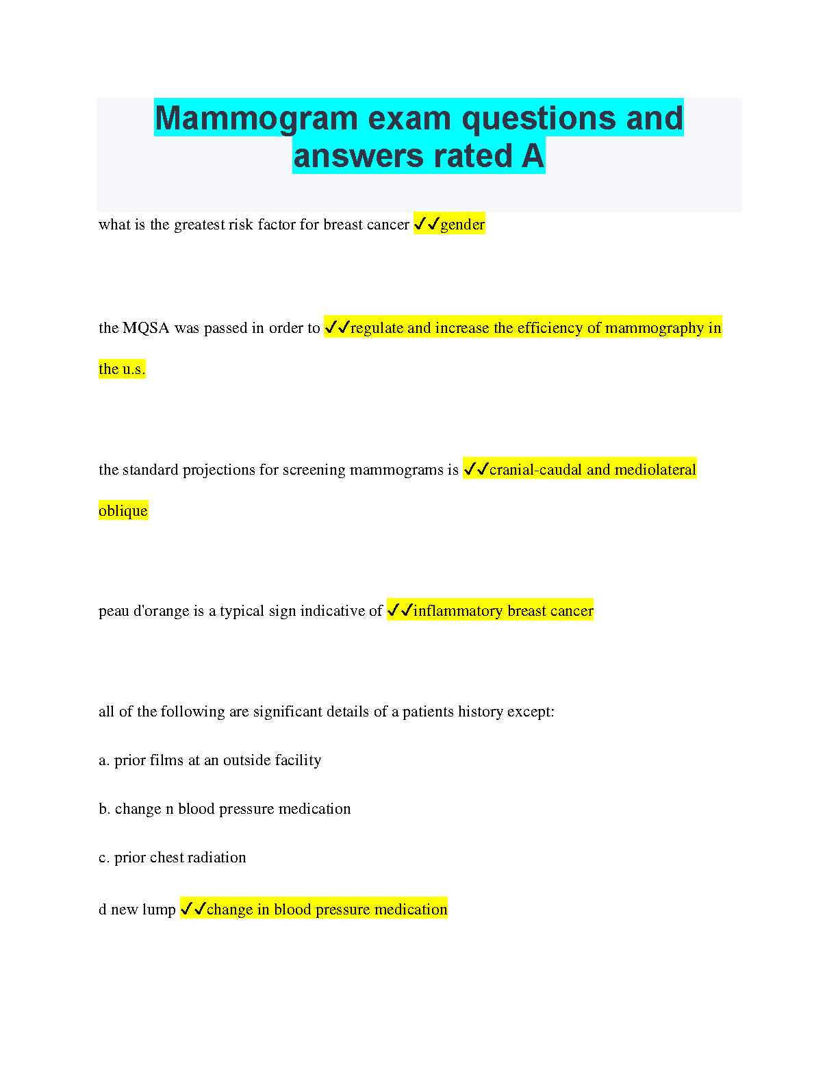Mammogram Exam Questions and Answers Rated A - Practice Questions and Answers for Nurses and Students - 2024/2025 Edition