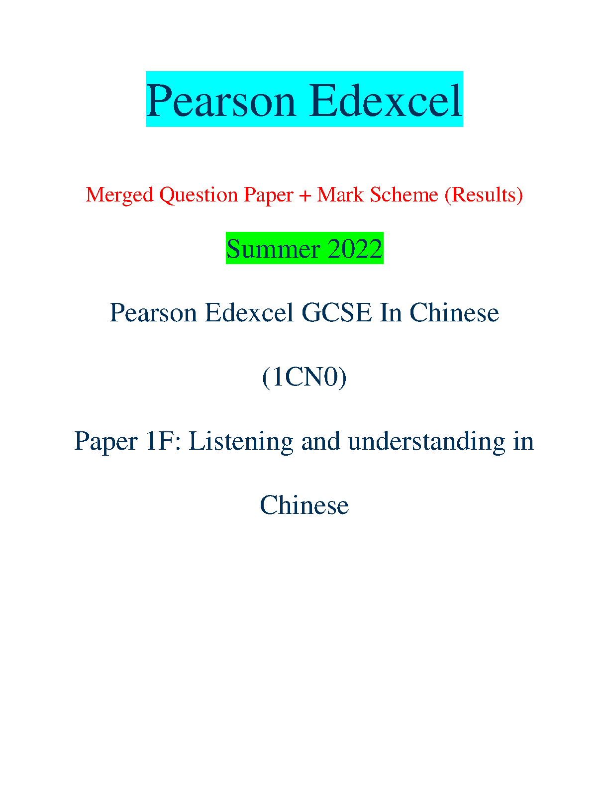 This resource contains the Pearson Edexcel GCSE in Chinese (1CN0) Paper 1F: Listening and understanding in Chinese, question paper and mark scheme for the Summer 2022 examination session. This is a useful resource for students to practice exam questions and gain a better understanding of the exam format.