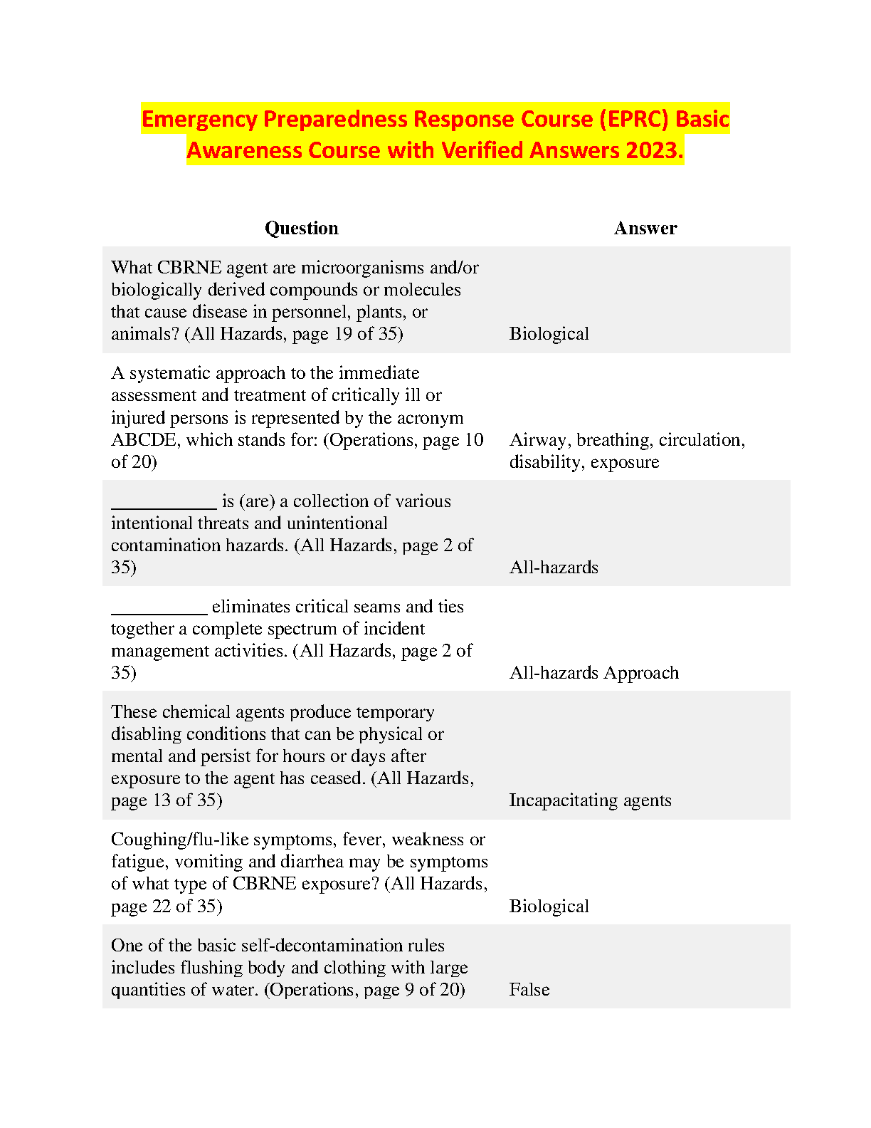 This comprehensive Emergency Preparedness Response Course (EPRC) Basic Awareness Course with Verified Answers 2023 Edition, will help you prepare for your upcoming exam with a comprehensive review of all the important concepts.